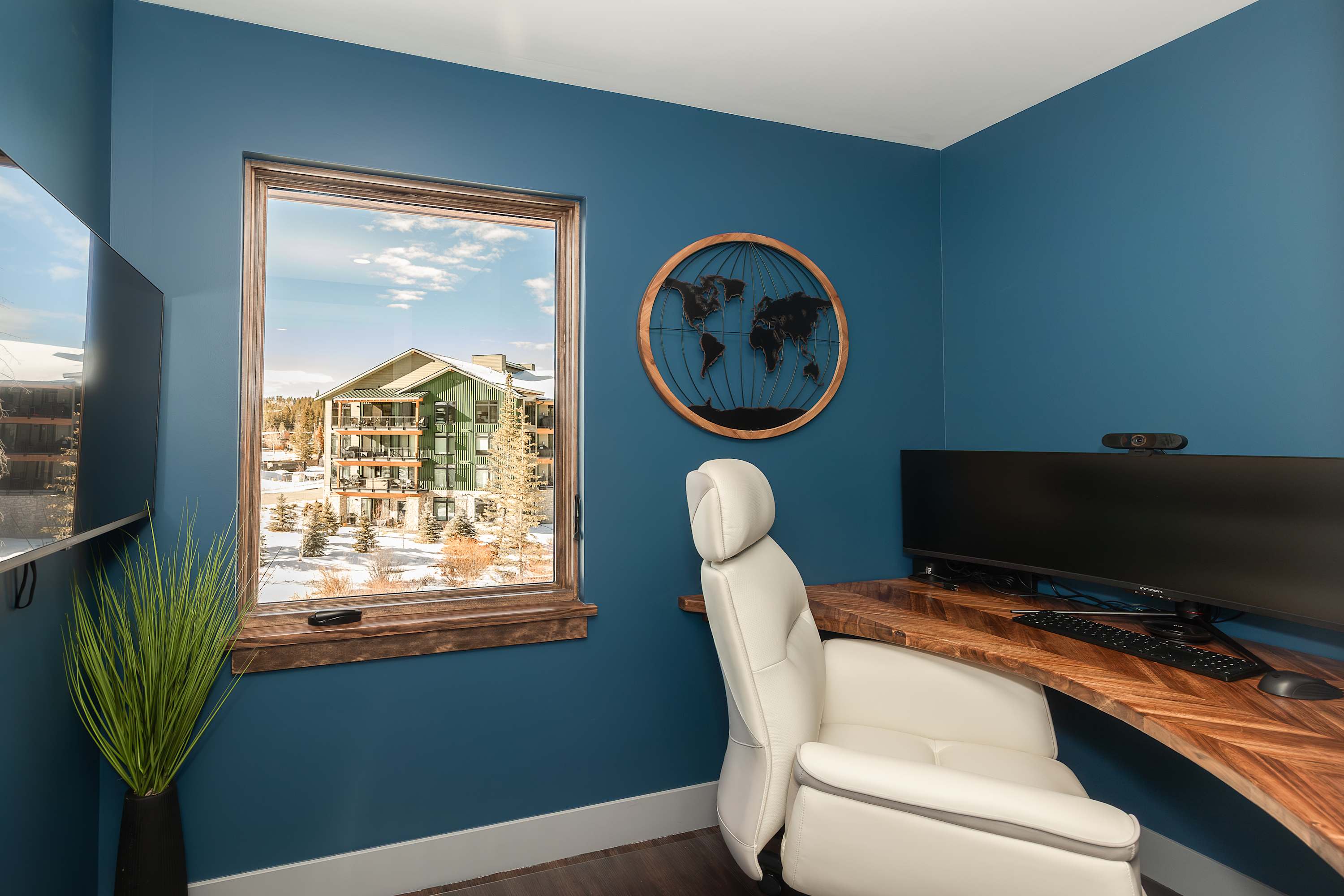 A dedicated workspace with a custom desk and comfortable seating offers a quiet place to focus, take meetings, or ease into the morning with natural light and views. Positioned away from the main living areas, it supports remote work without distractions.