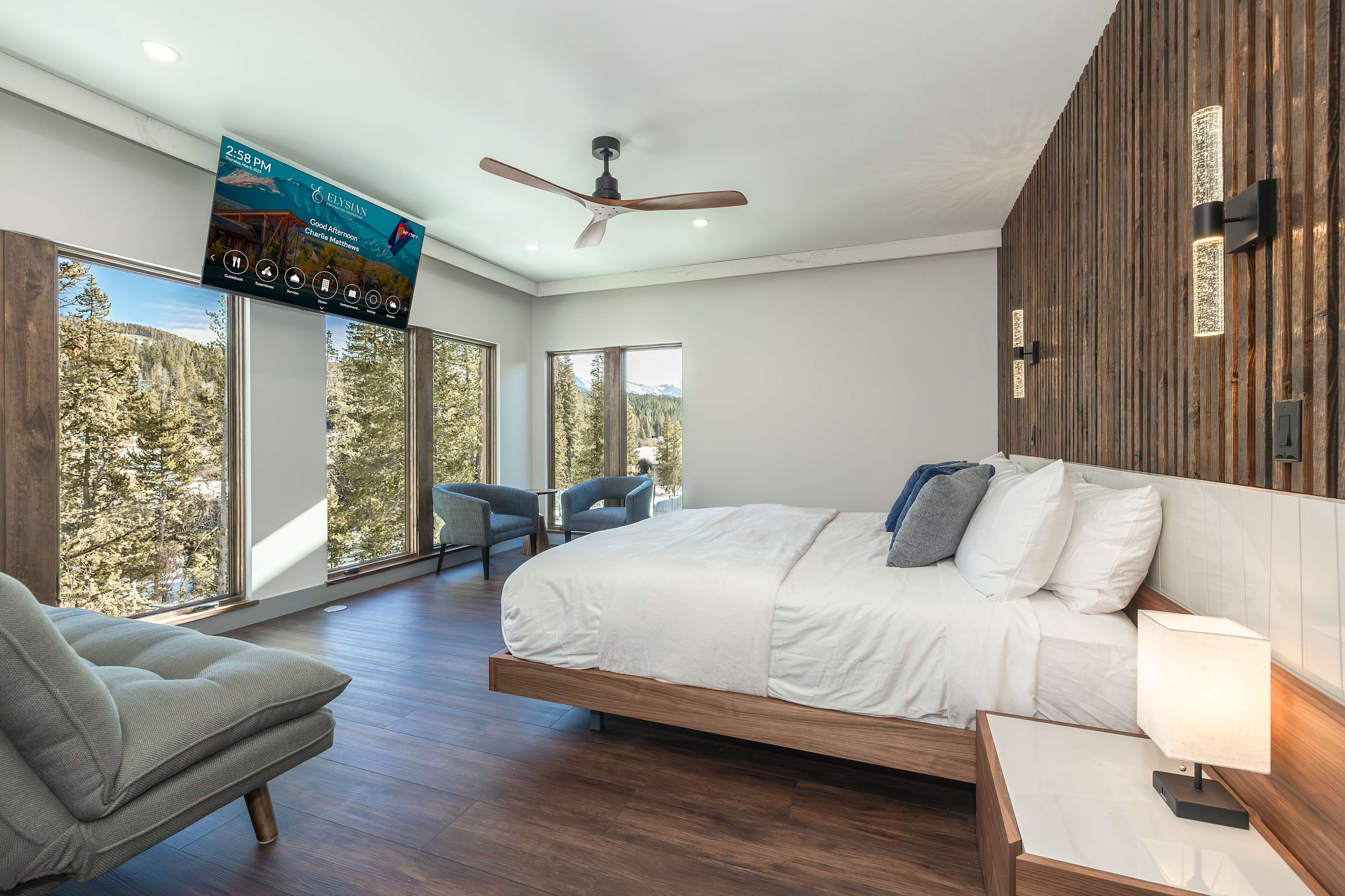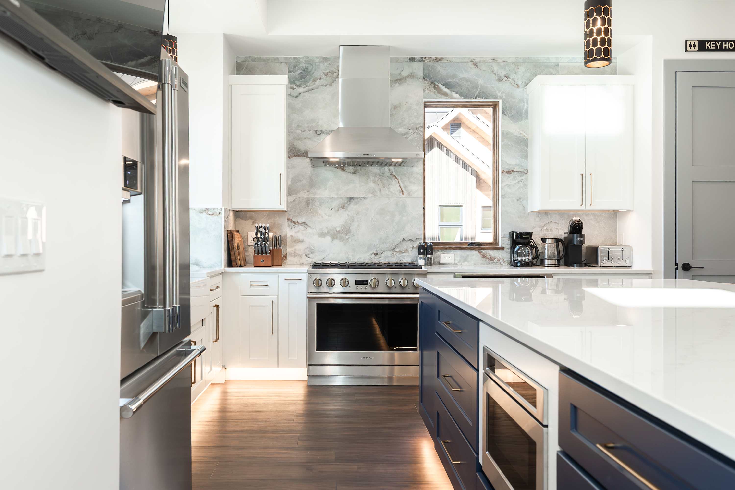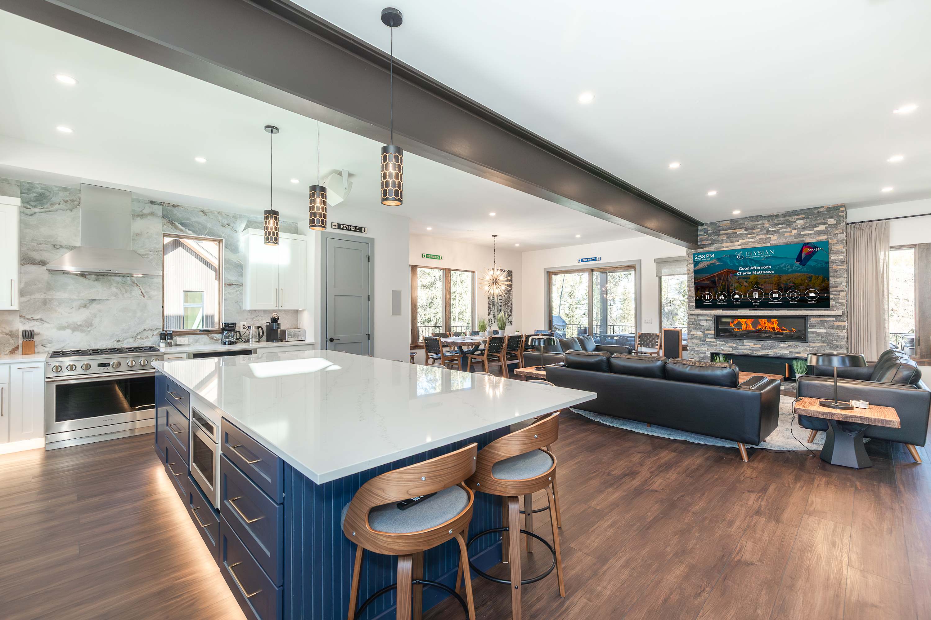 The main living level sets the tone with an expansive open concept layout anchored by a striking fireplace and comfortable seating designed for conversation and unwinding after a day outdoors. Large windows bring the surrounding landscape inside, while the dining area invites long meals and shared stories. The chef’s kitchen is beautifully finished and fully equipped, featuring an oversized island with seating, high end appliances, and everything needed to host with ease.