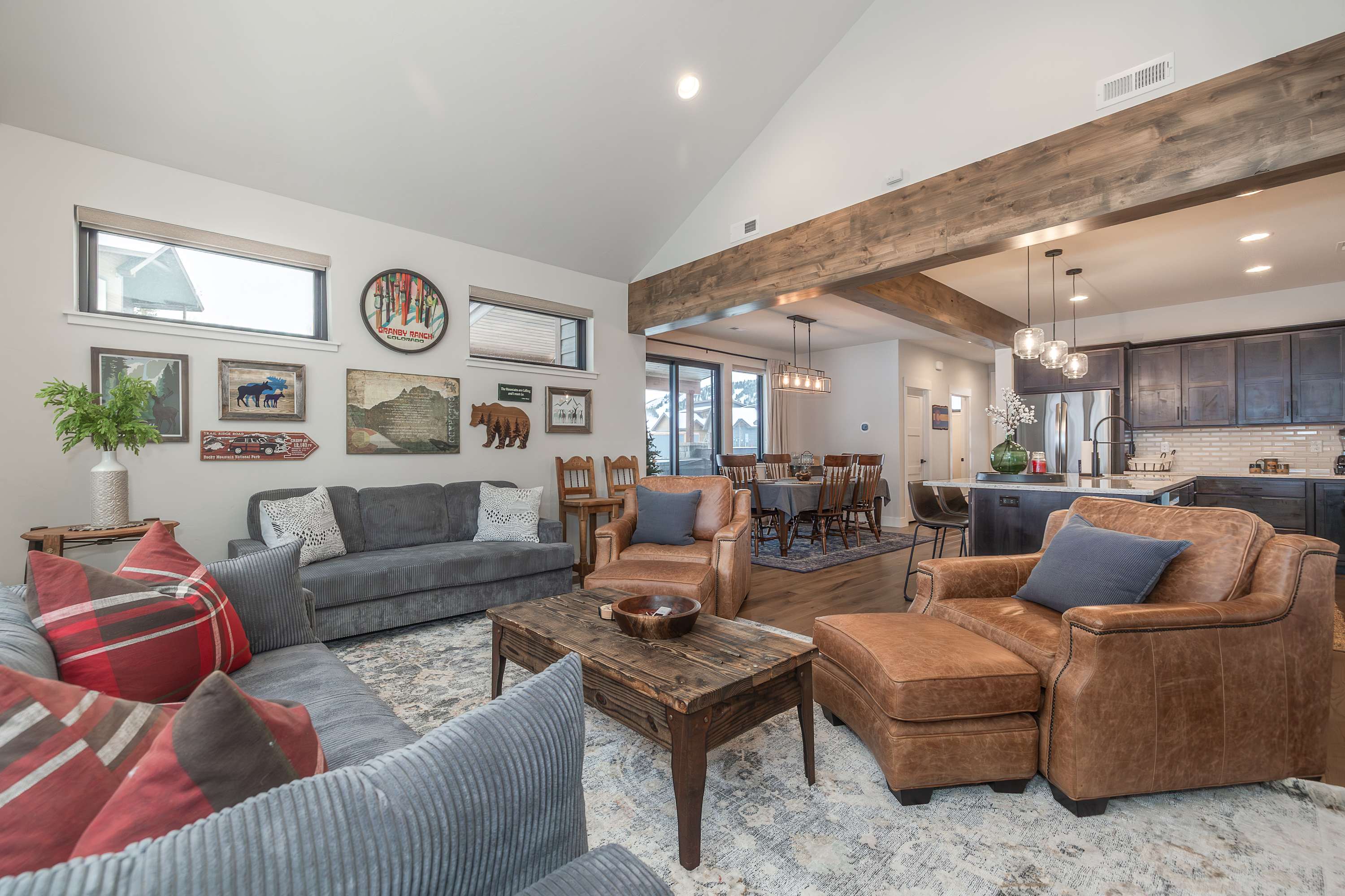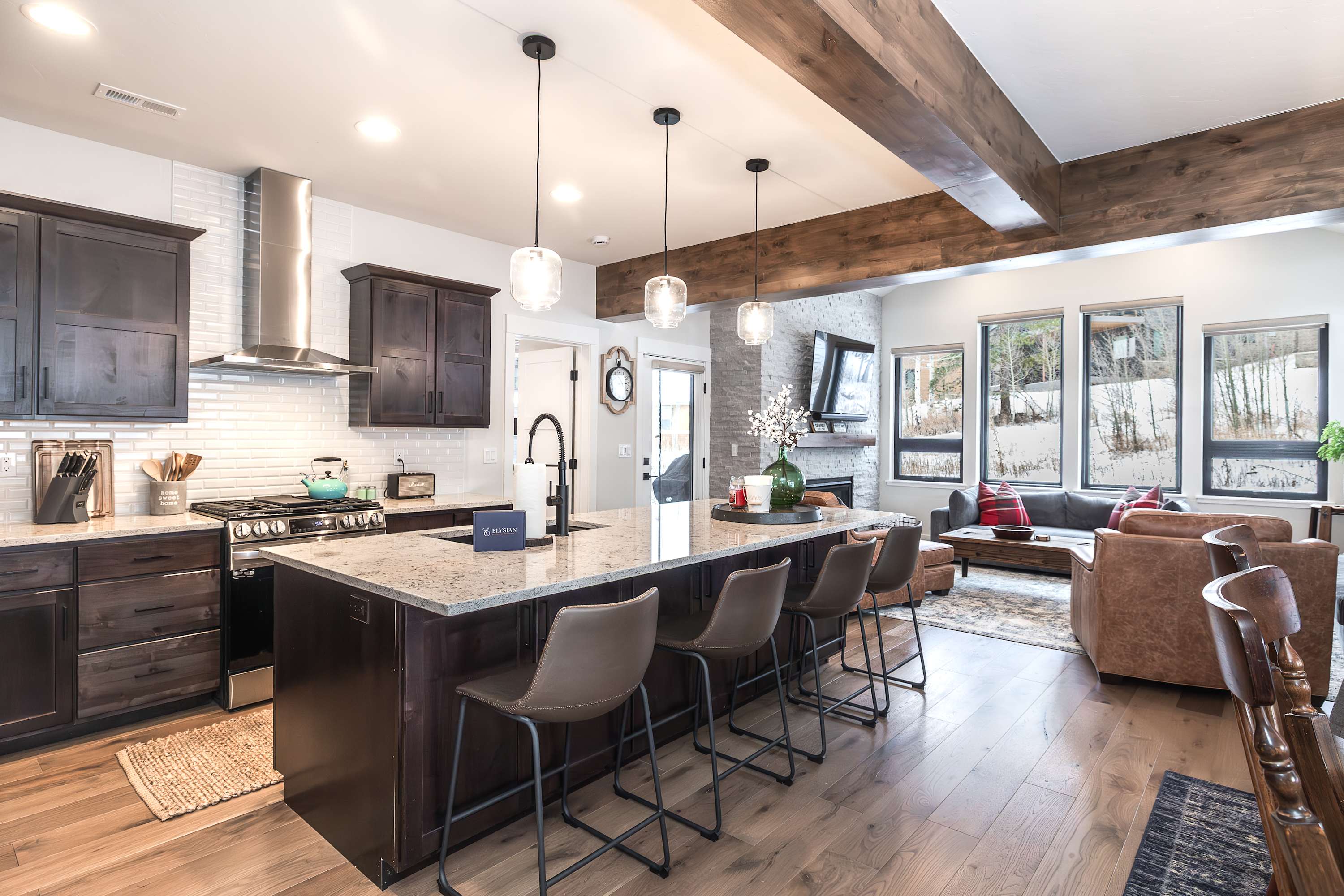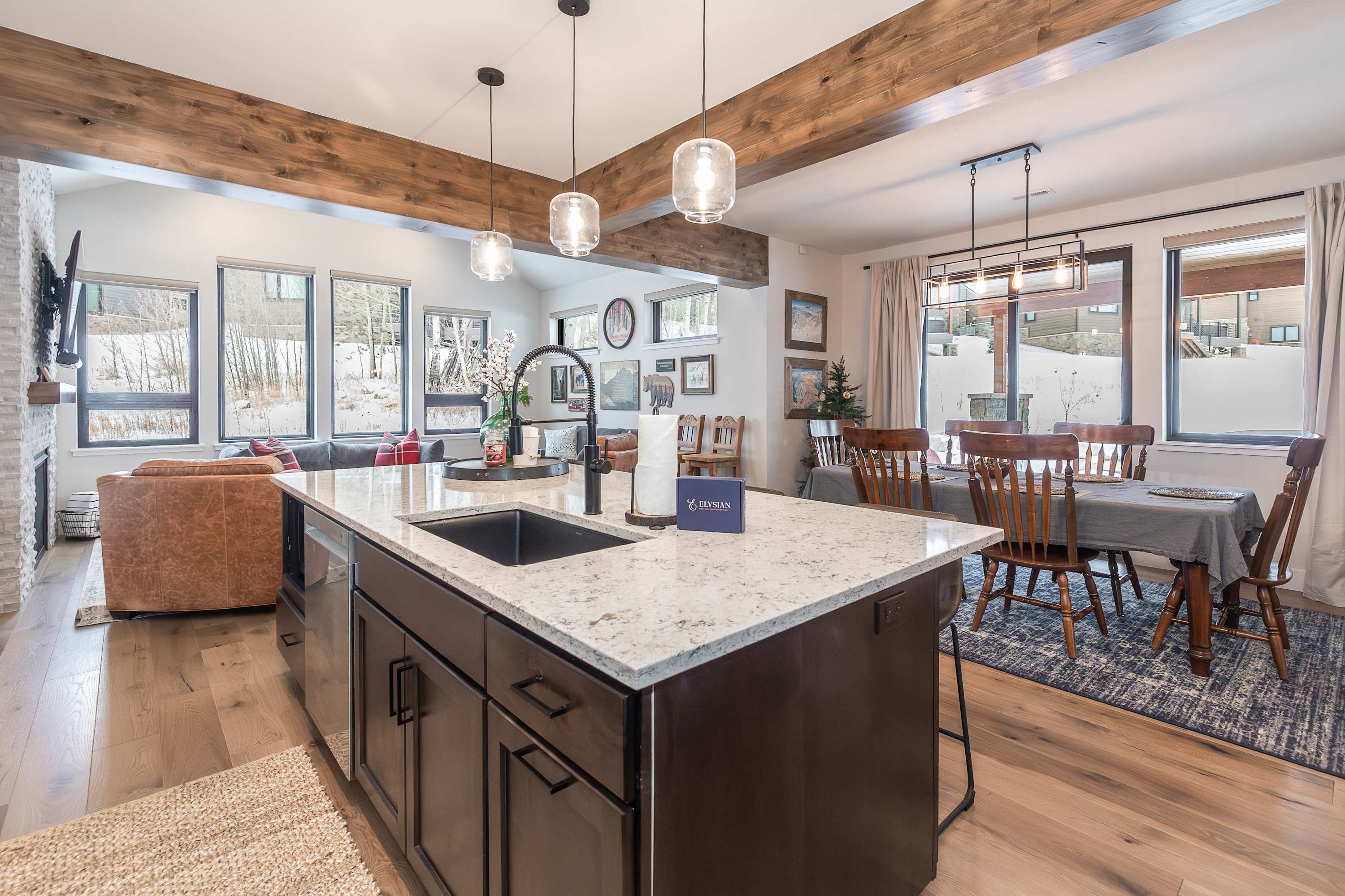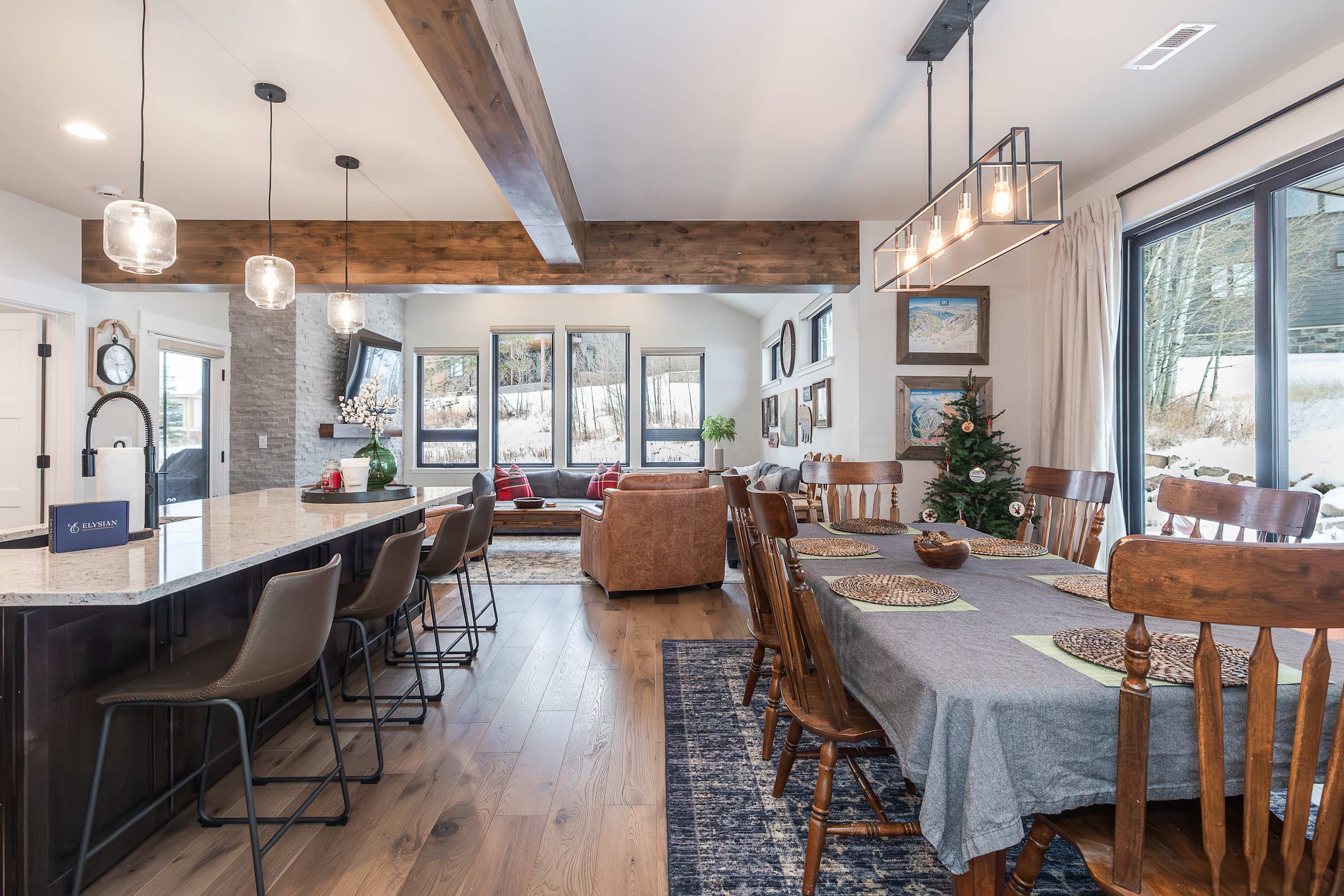 The main level is designed for connection. A spacious great room anchors the home, framed by large windows and centered around a modern fireplace that invites conversation and unhurried evenings. The open kitchen features high end finishes, generous counter space, and a large island that naturally becomes the heart of the home. Adjacent dining allows meals to unfold easily, whether it’s a quick breakfast before first tracks or a lingering dinner after a full day outside.