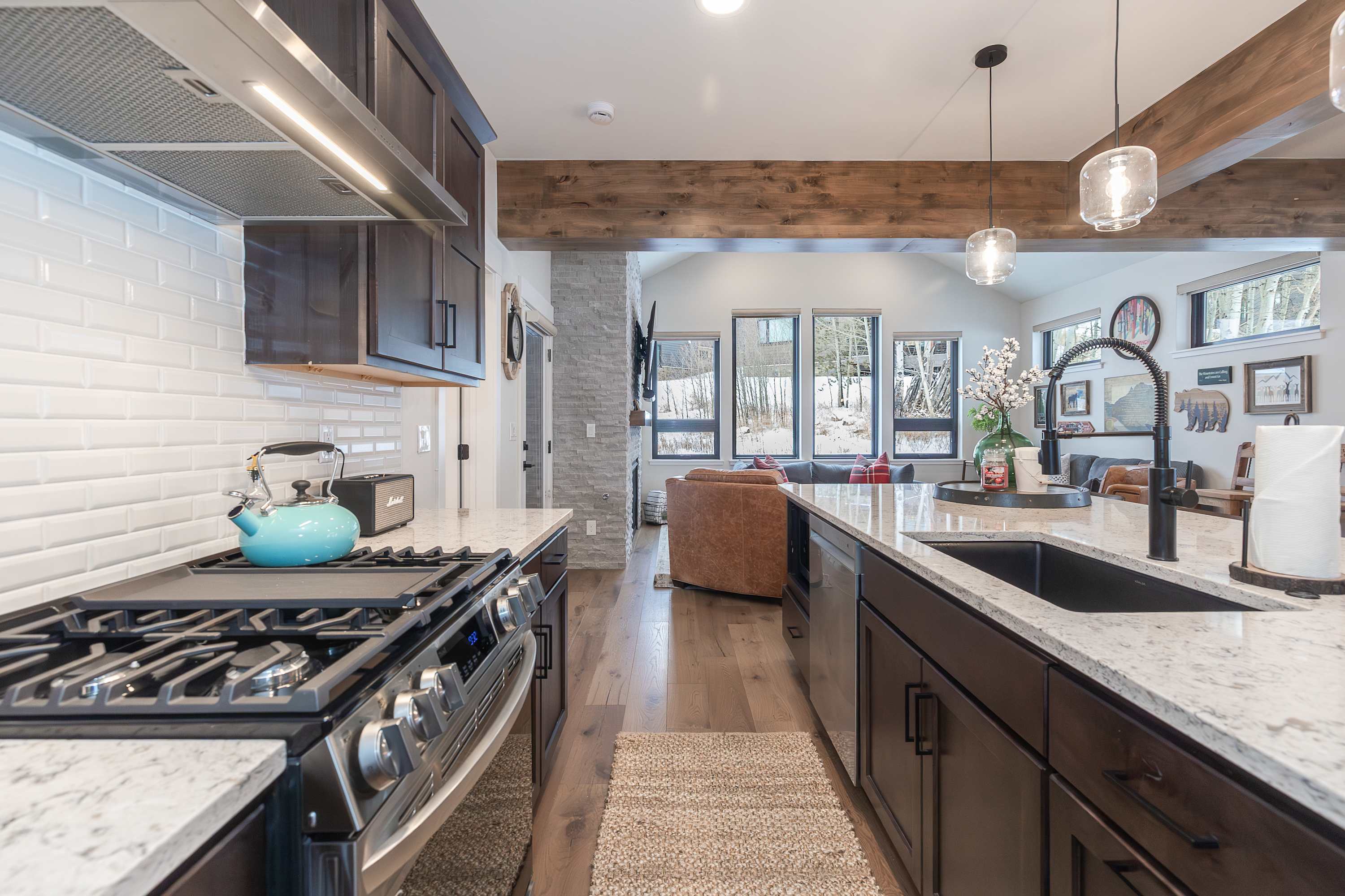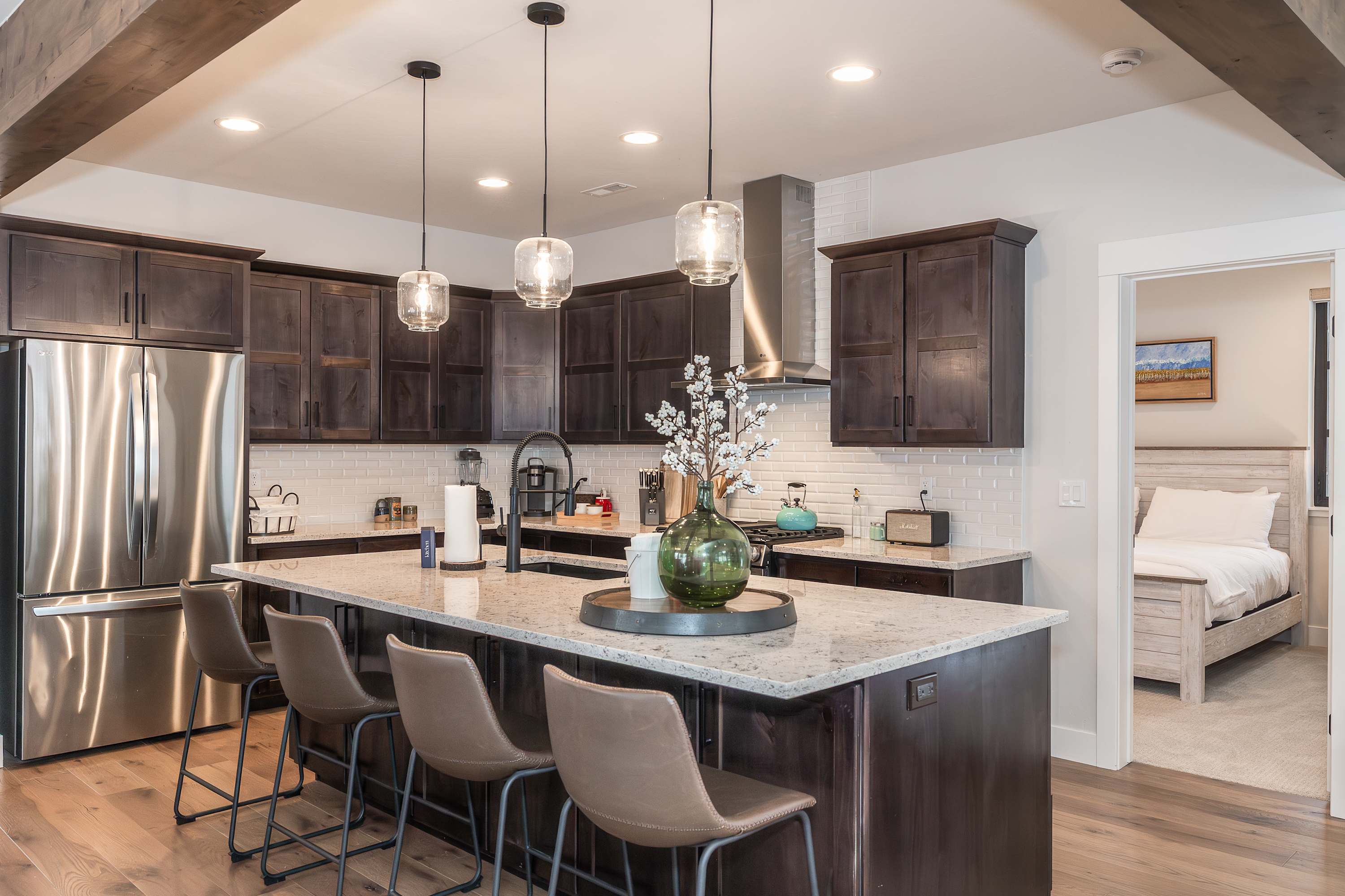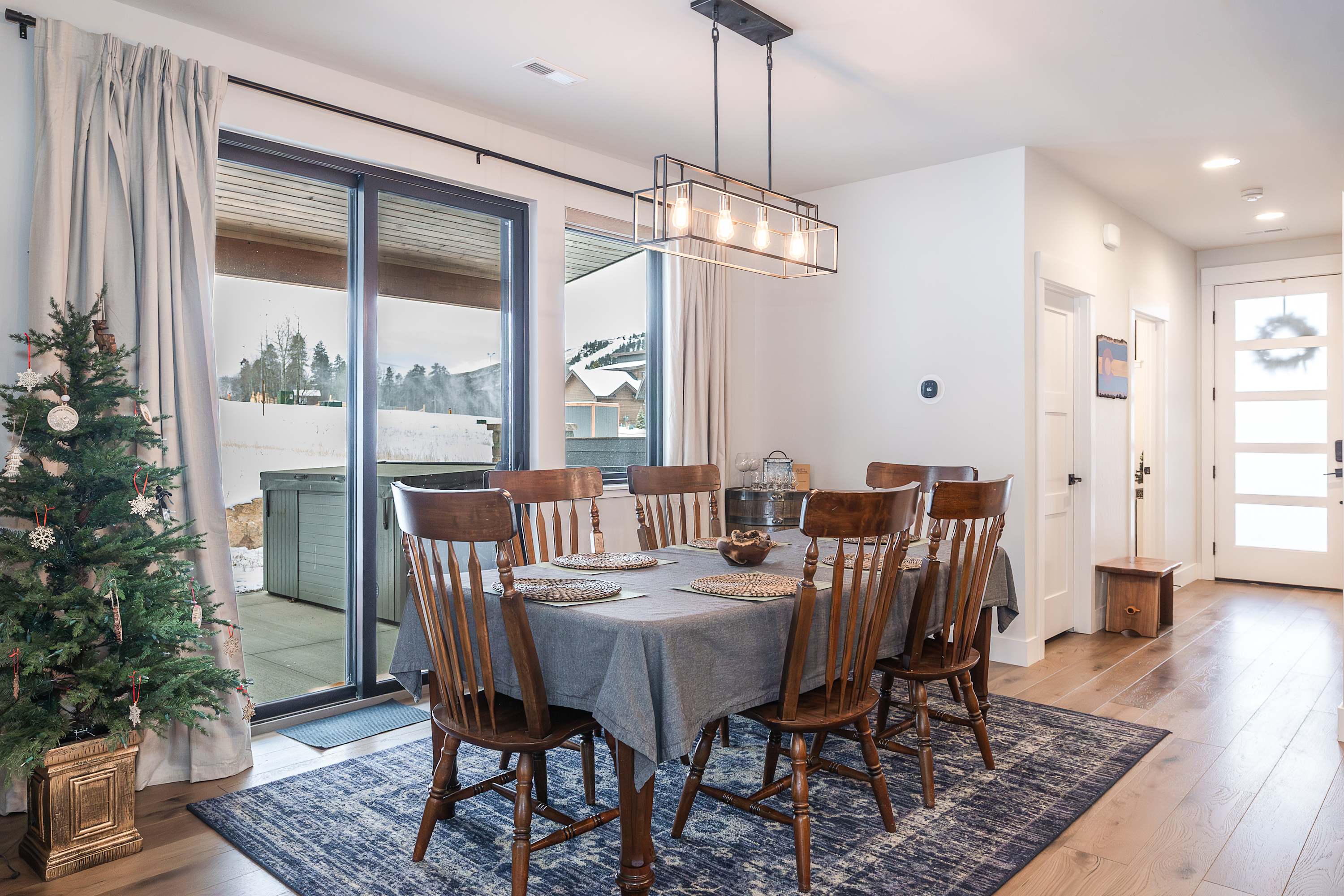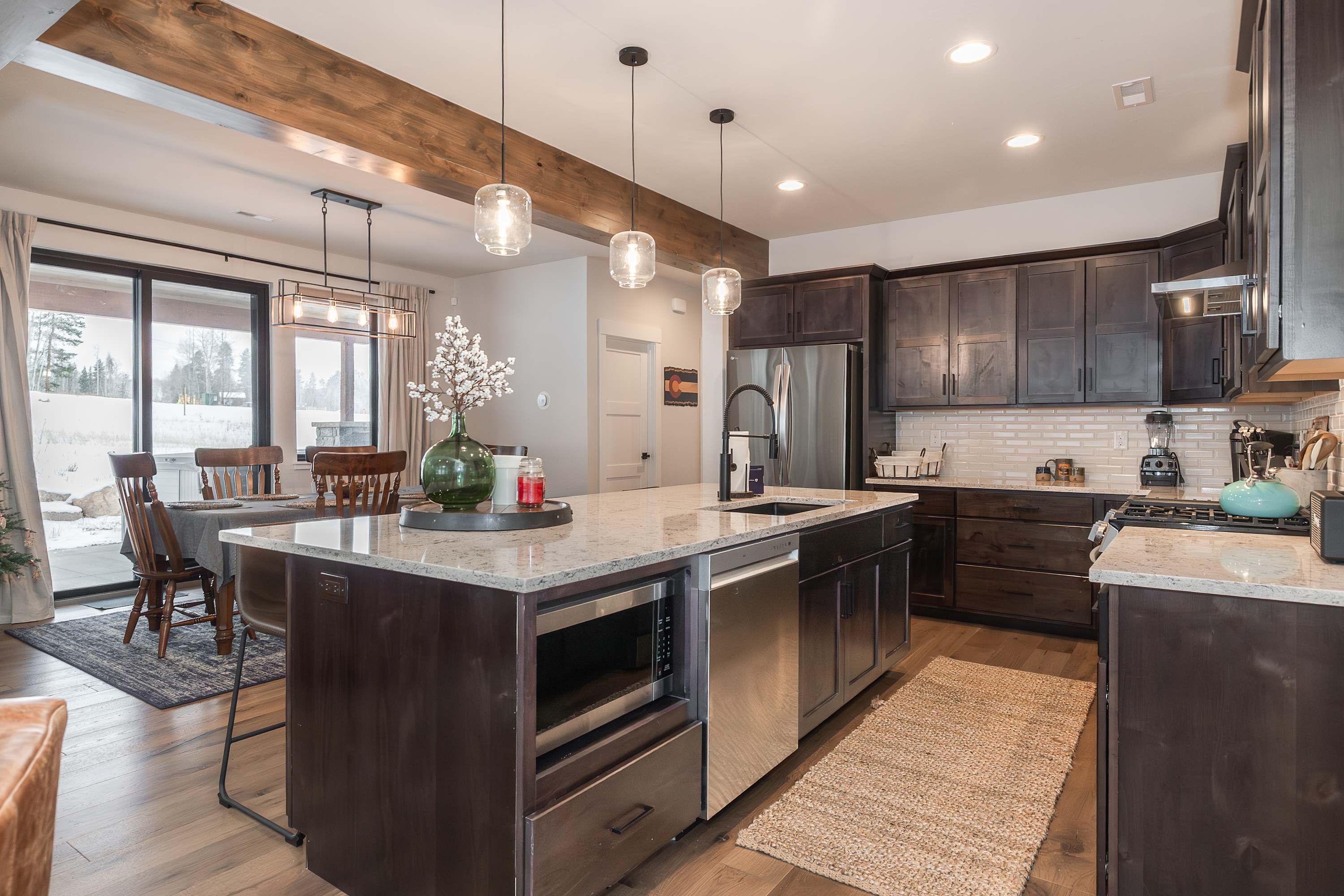 The main level is designed for connection. A spacious great room anchors the home, framed by large windows and centered around a modern fireplace that invites conversation and unhurried evenings. The open kitchen features high end finishes, generous counter space, and a large island that naturally becomes the heart of the home. Adjacent dining allows meals to unfold easily, whether it’s a quick breakfast before first tracks or a lingering dinner after a full day outside.