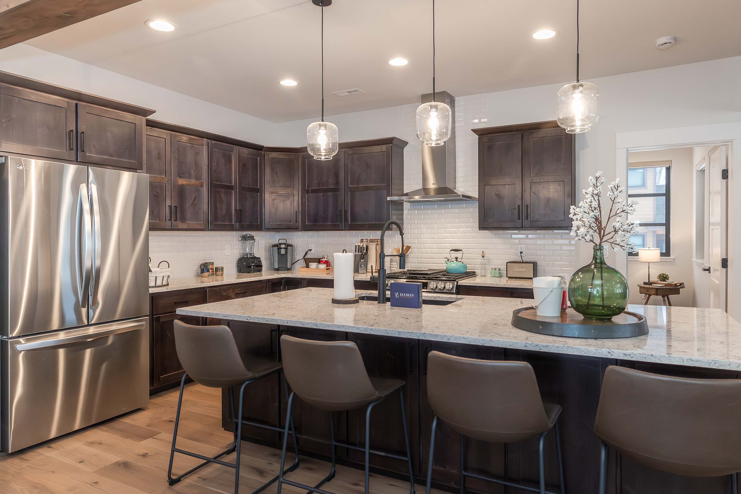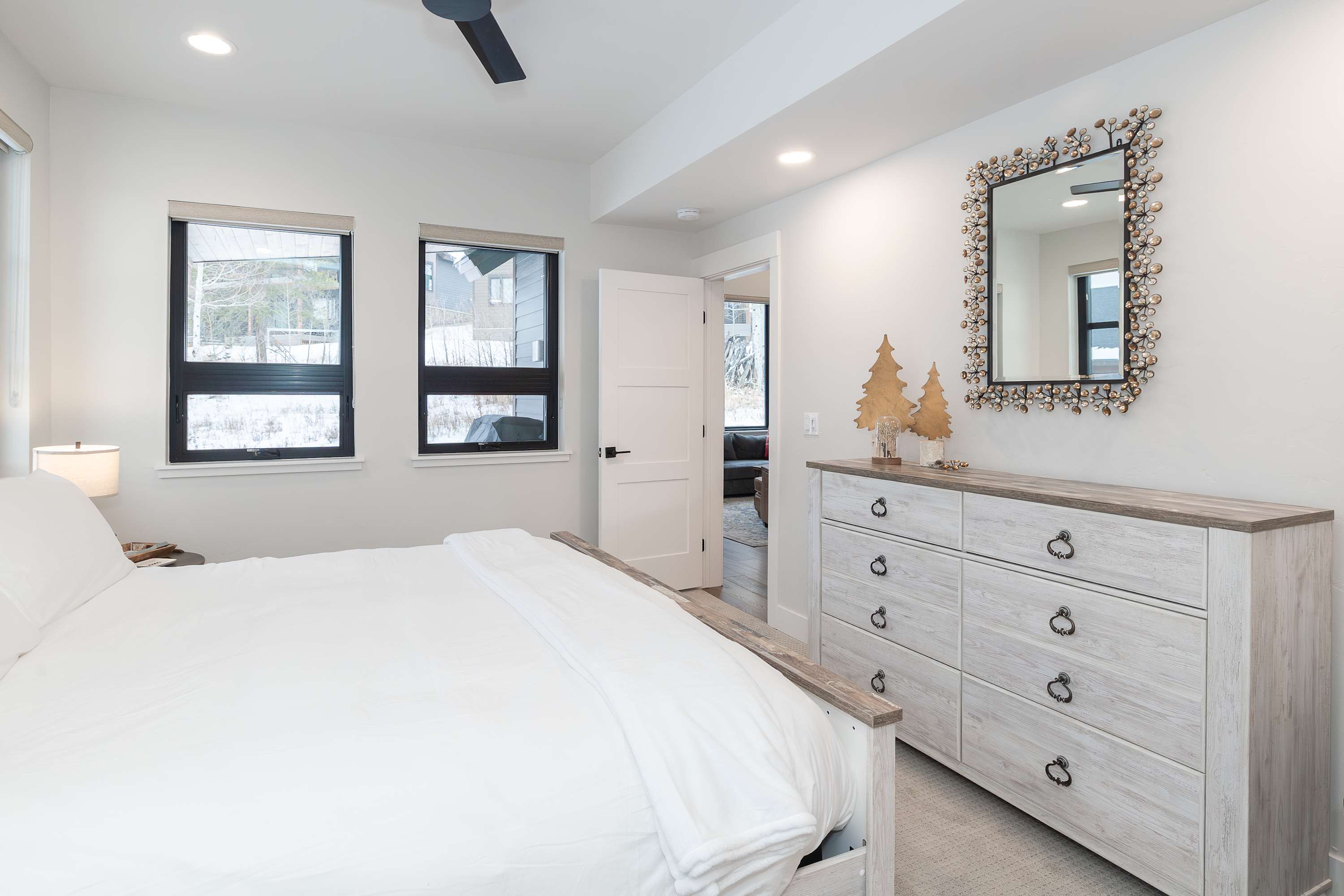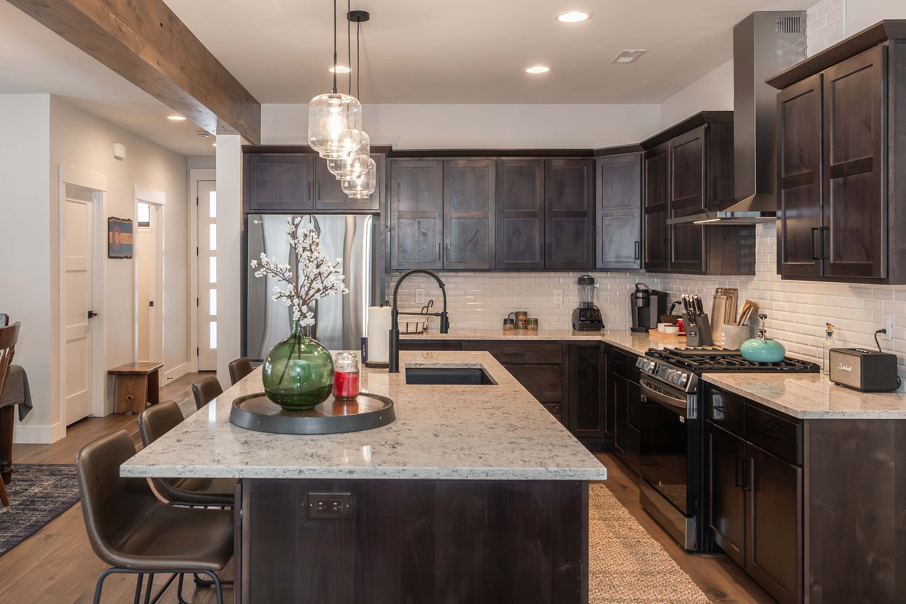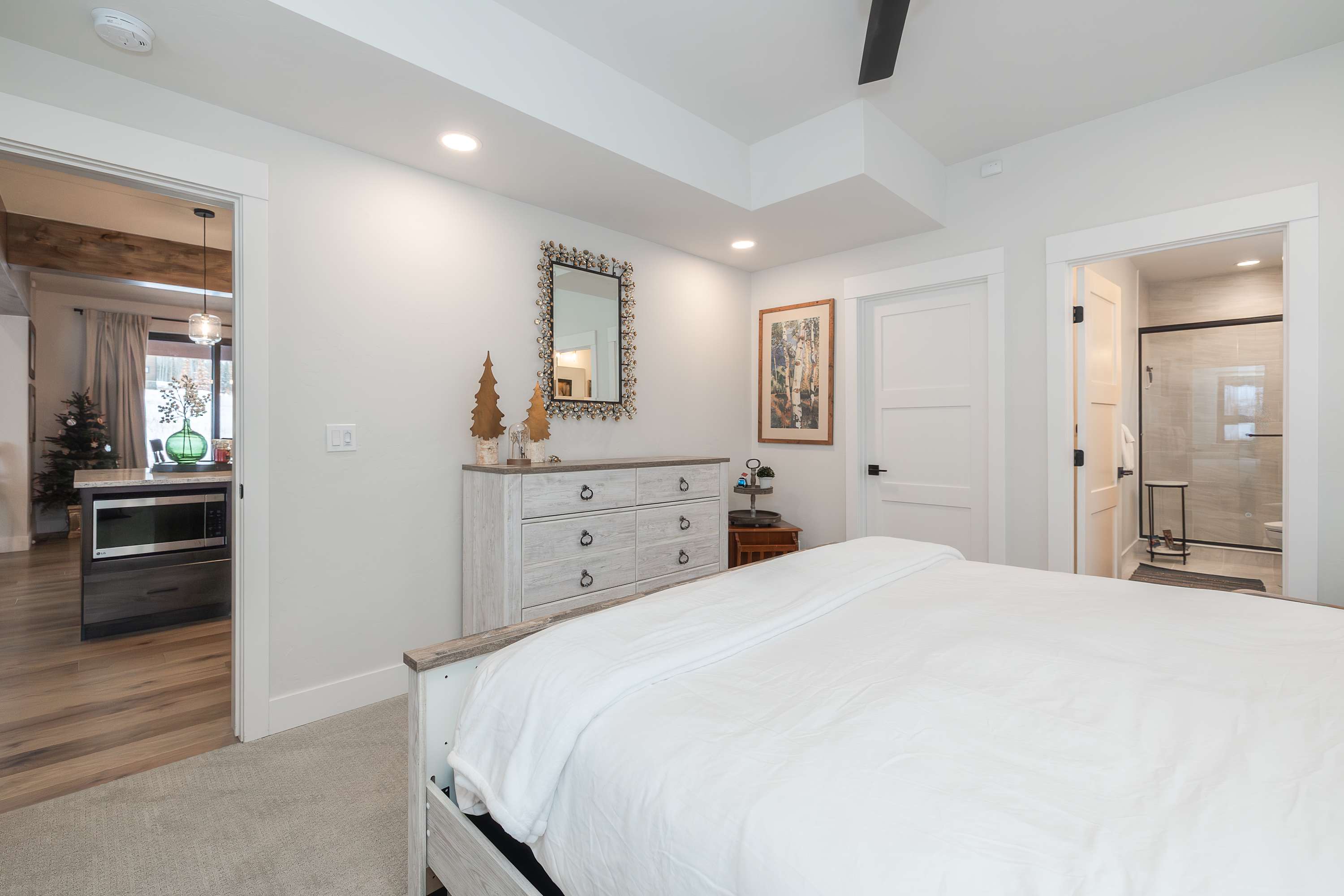 The main level is designed for connection. A spacious great room anchors the home, framed by large windows and centered around a modern fireplace that invites conversation and unhurried evenings. The open kitchen features high end finishes, generous counter space, and a large island that naturally becomes the heart of the home. Adjacent dining allows meals to unfold easily, whether it’s a quick breakfast before first tracks or a lingering dinner after a full day outside.
