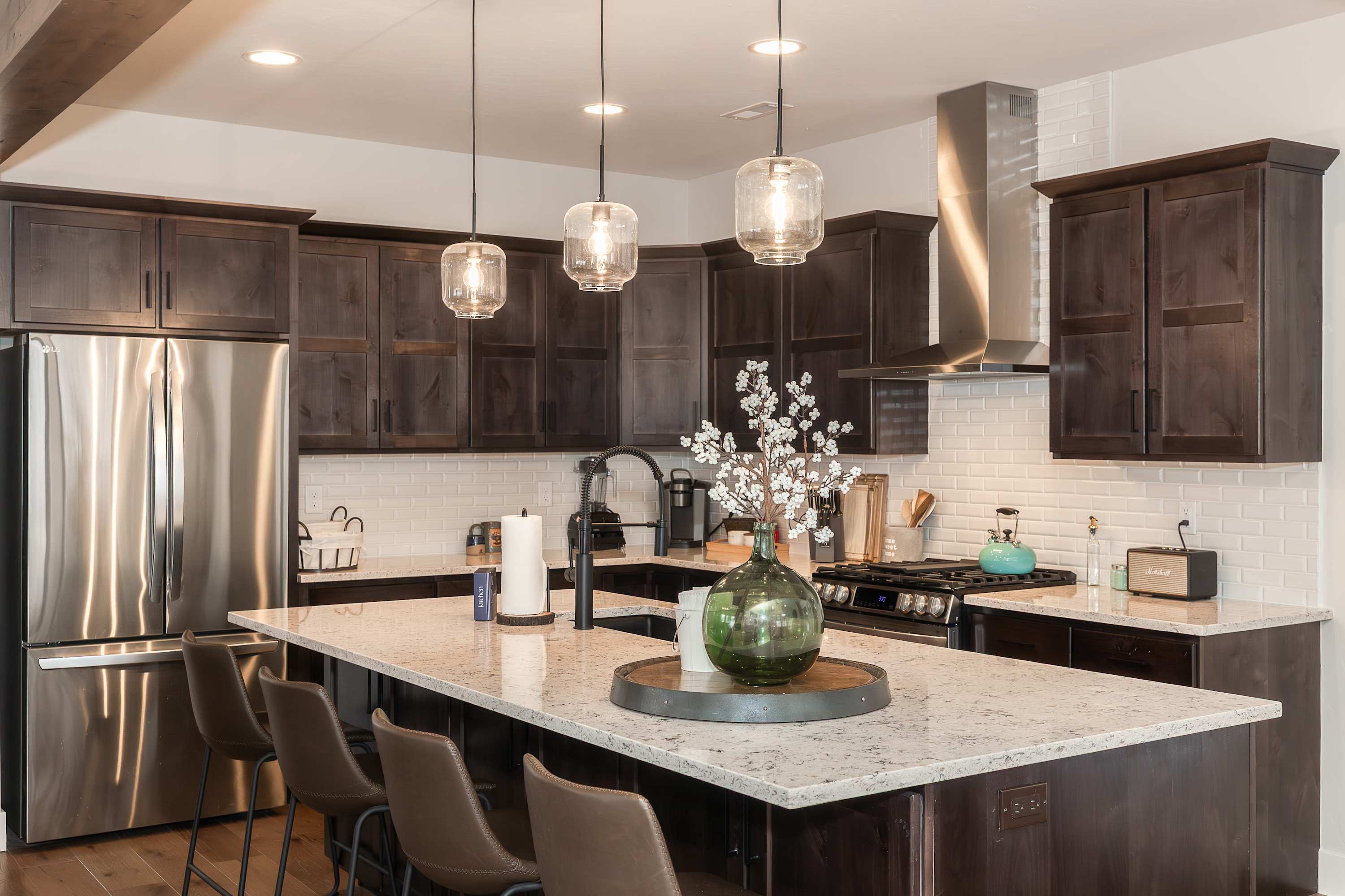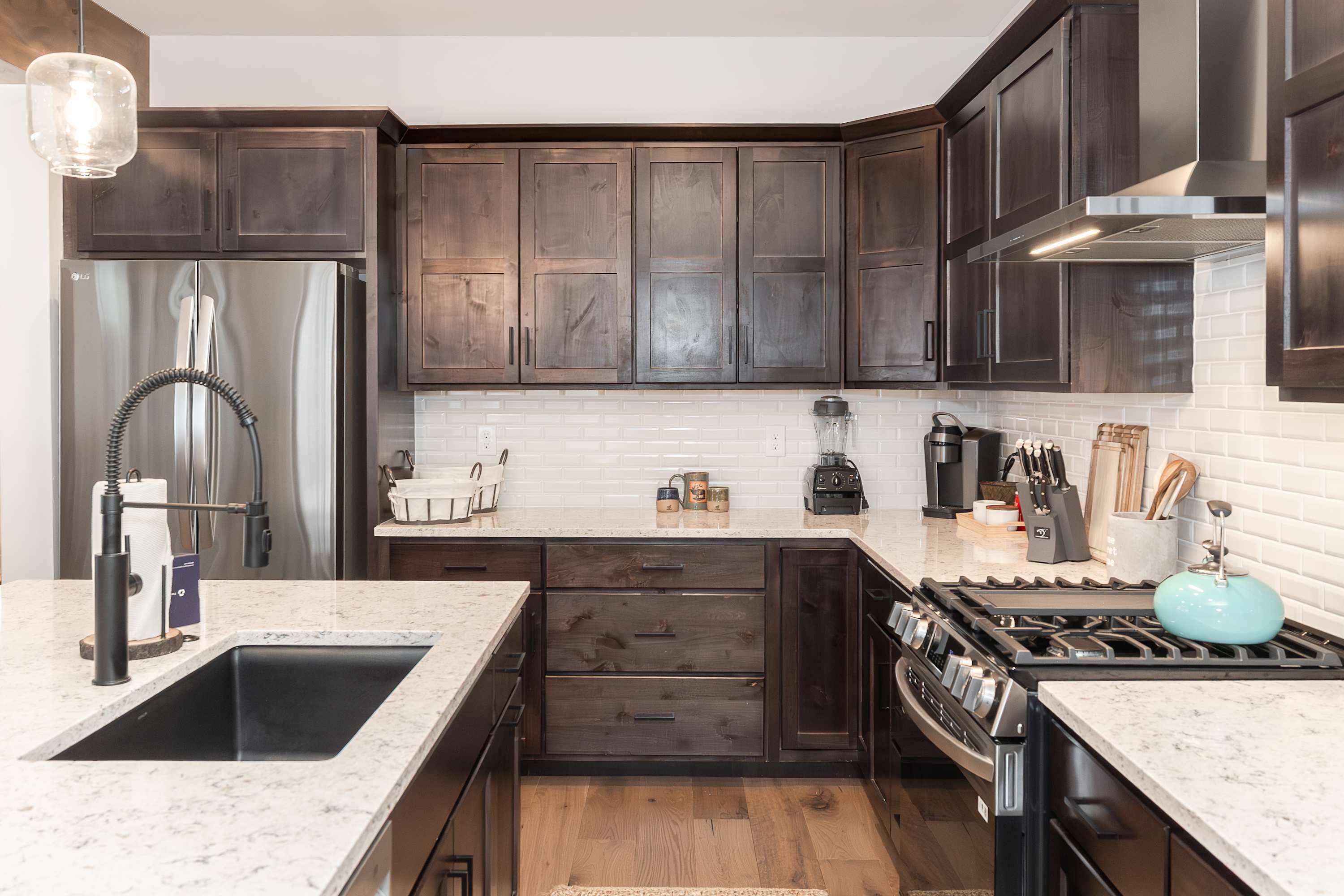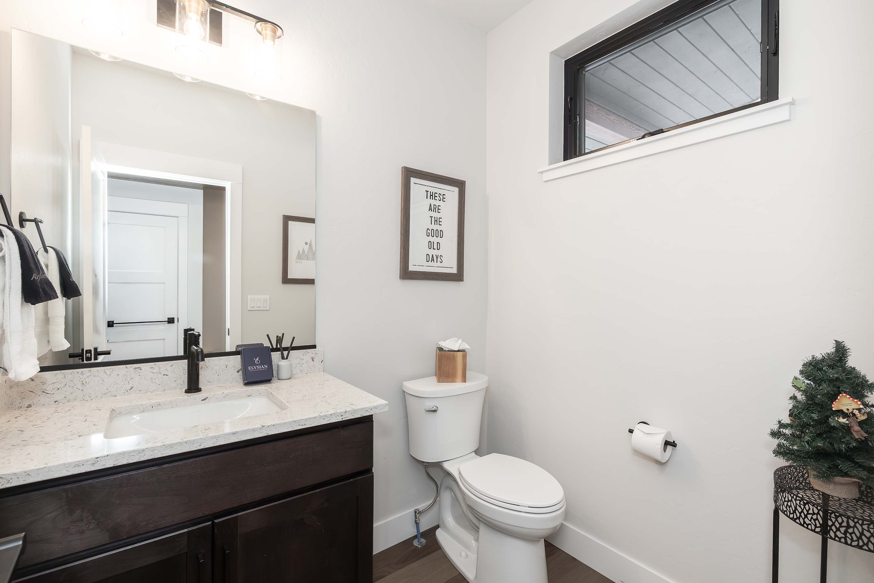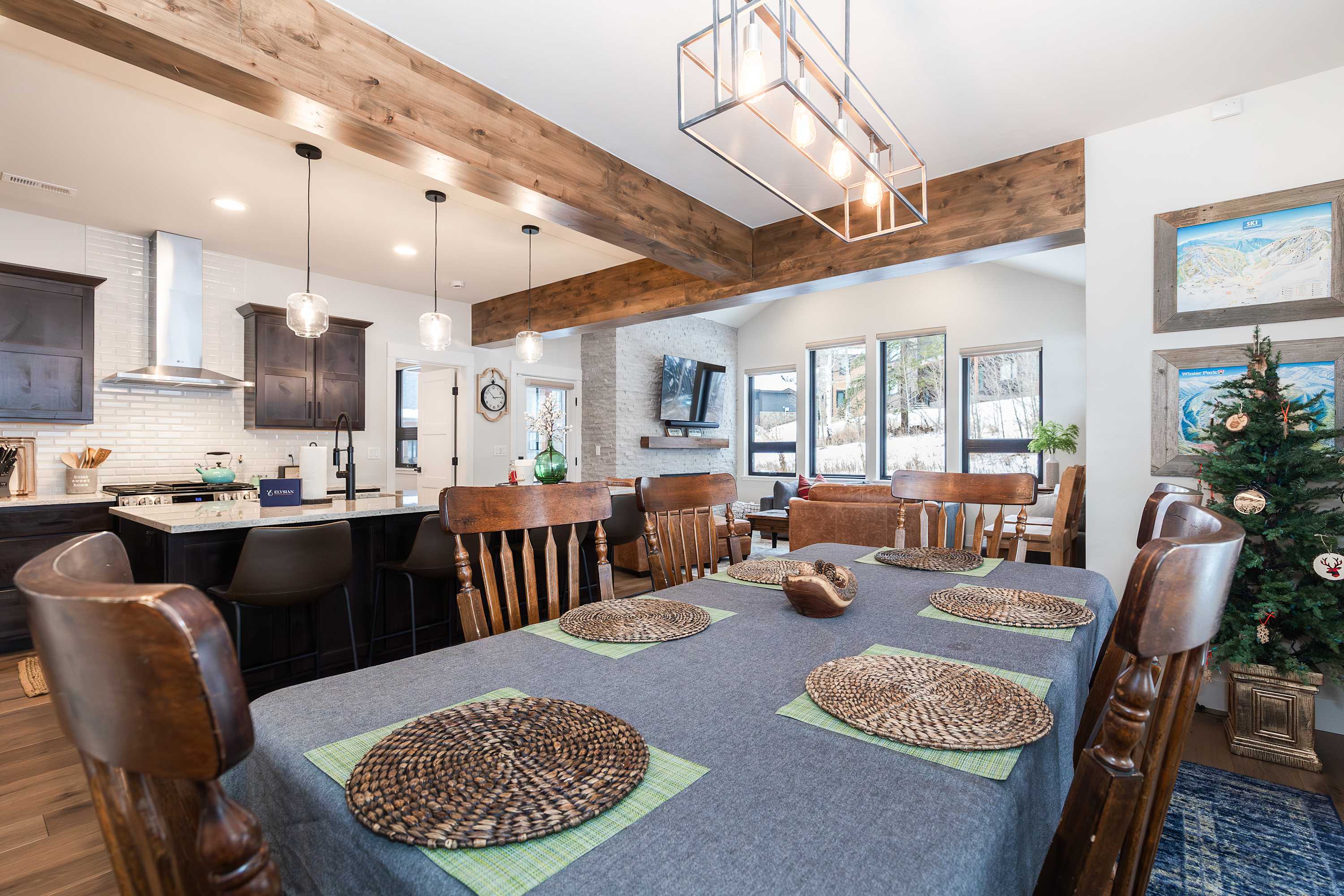 The main level is designed for connection. A spacious great room anchors the home, framed by large windows and centered around a modern fireplace that invites conversation and unhurried evenings. The open kitchen features high end finishes, generous counter space, and a large island that naturally becomes the heart of the home. Adjacent dining allows meals to unfold easily, whether it’s a quick breakfast before first tracks or a lingering dinner after a full day outside.
