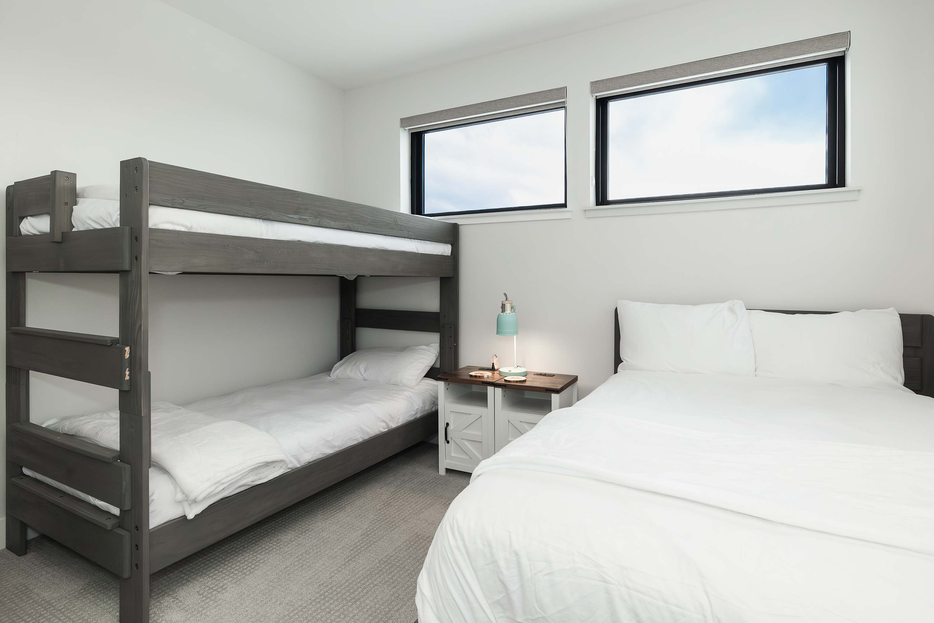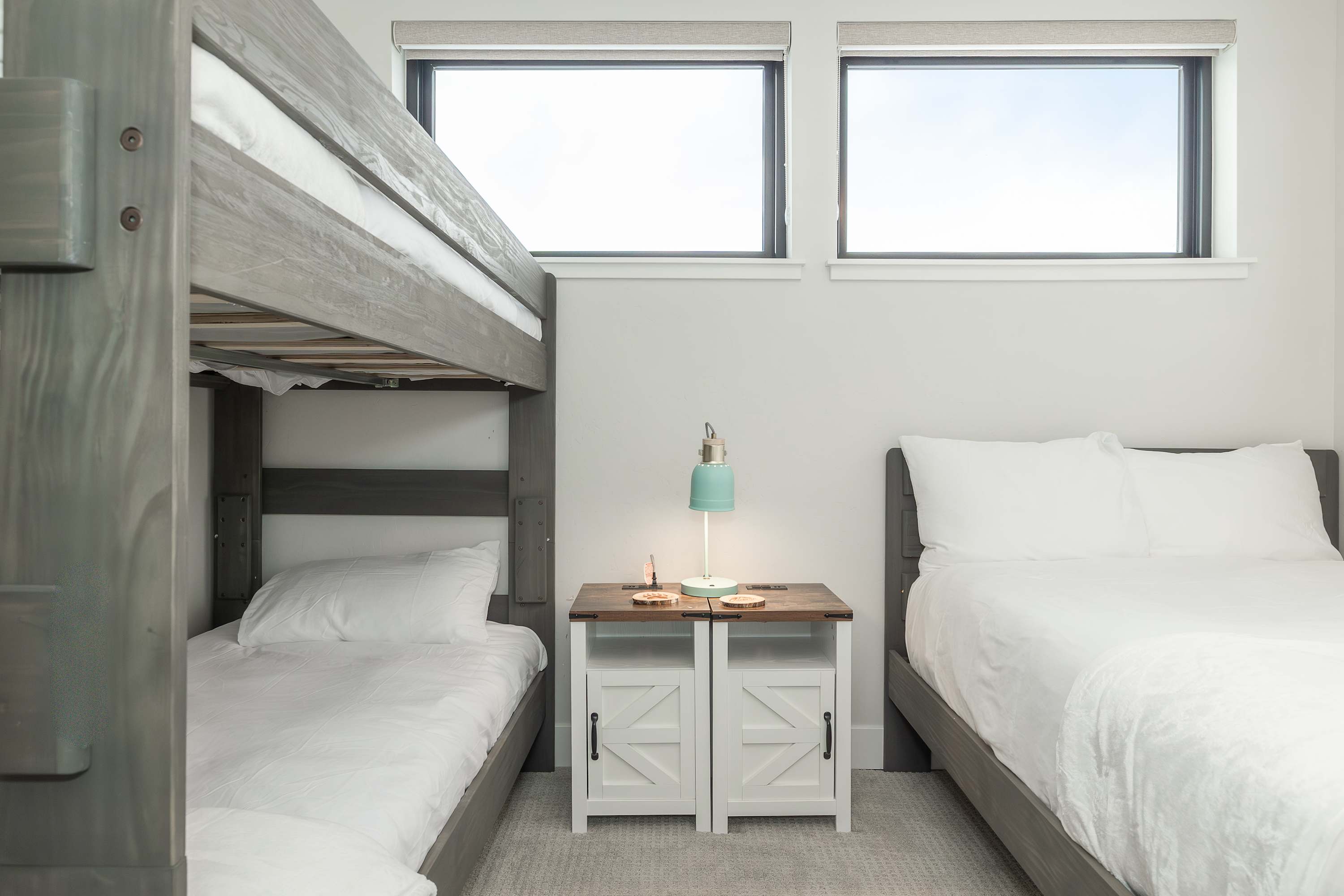 • Bunk Room (Upper Level): Full-sized bed, Twin over twin bunk