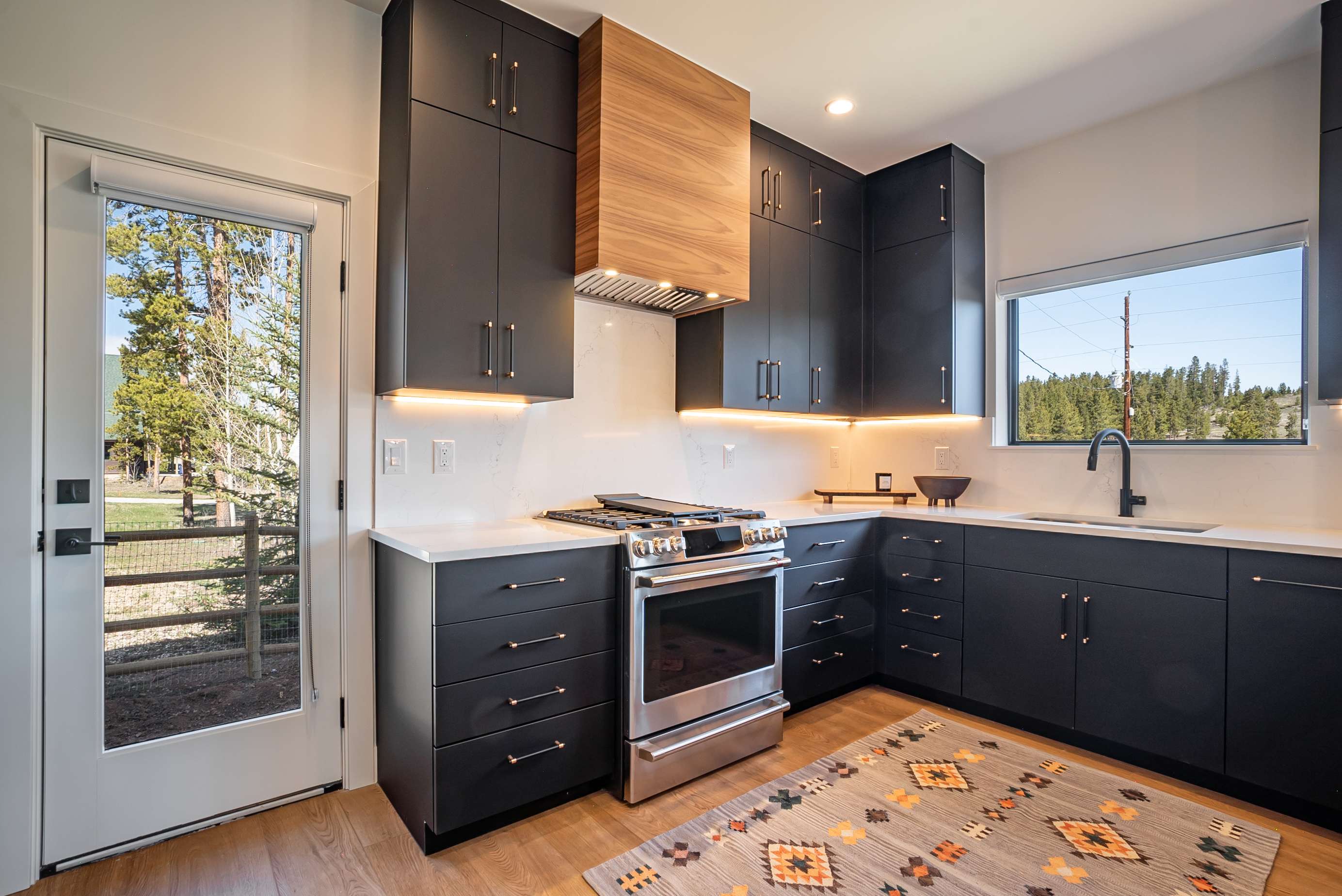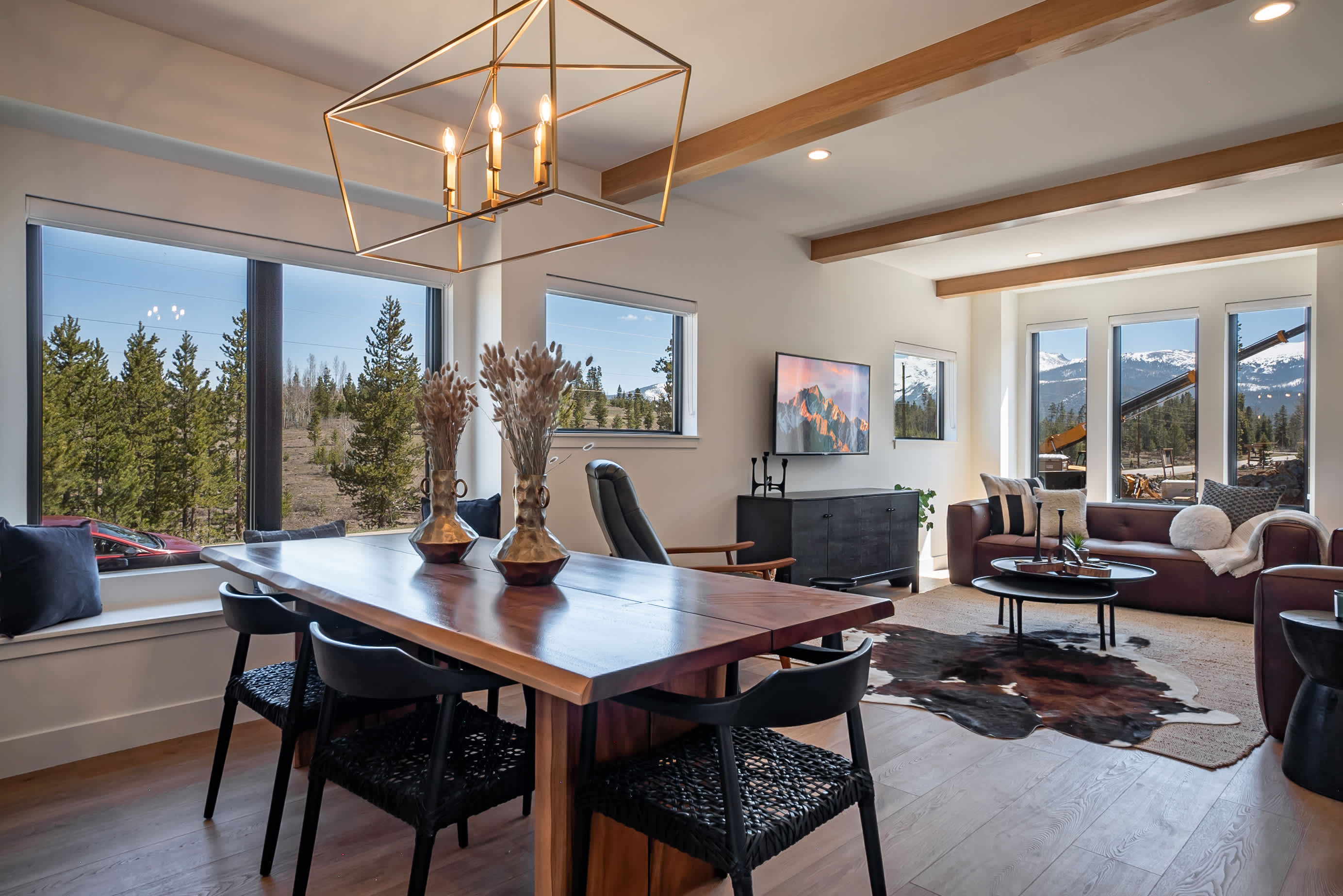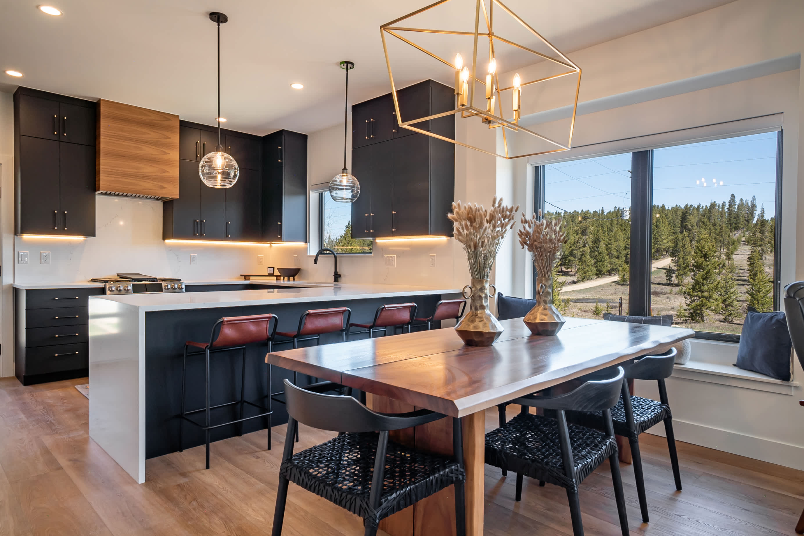 Step through the glass entryway into a world bathed in natural light , the open-concept great room features floor-to-ceiling windows, clean architectural lines, and cozy textures that blur the boundary between indoors and out. The chef-inspired kitchen offers waterfall-edge quartz countertops, designer cabinetry, and modern appliances, creating a perfect gathering space for après-ski cocktails or morning espresso with mountain air drifting through the pines.