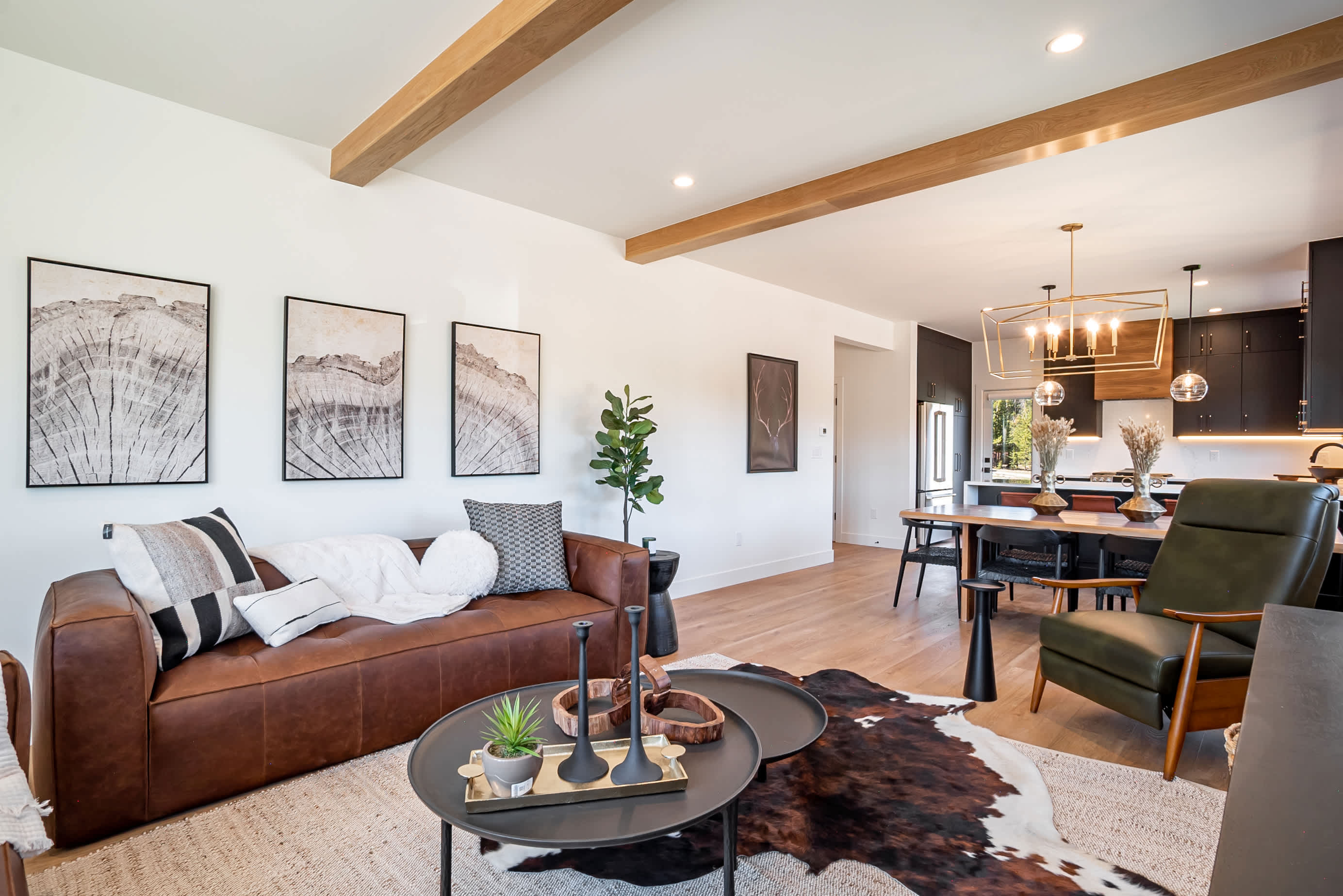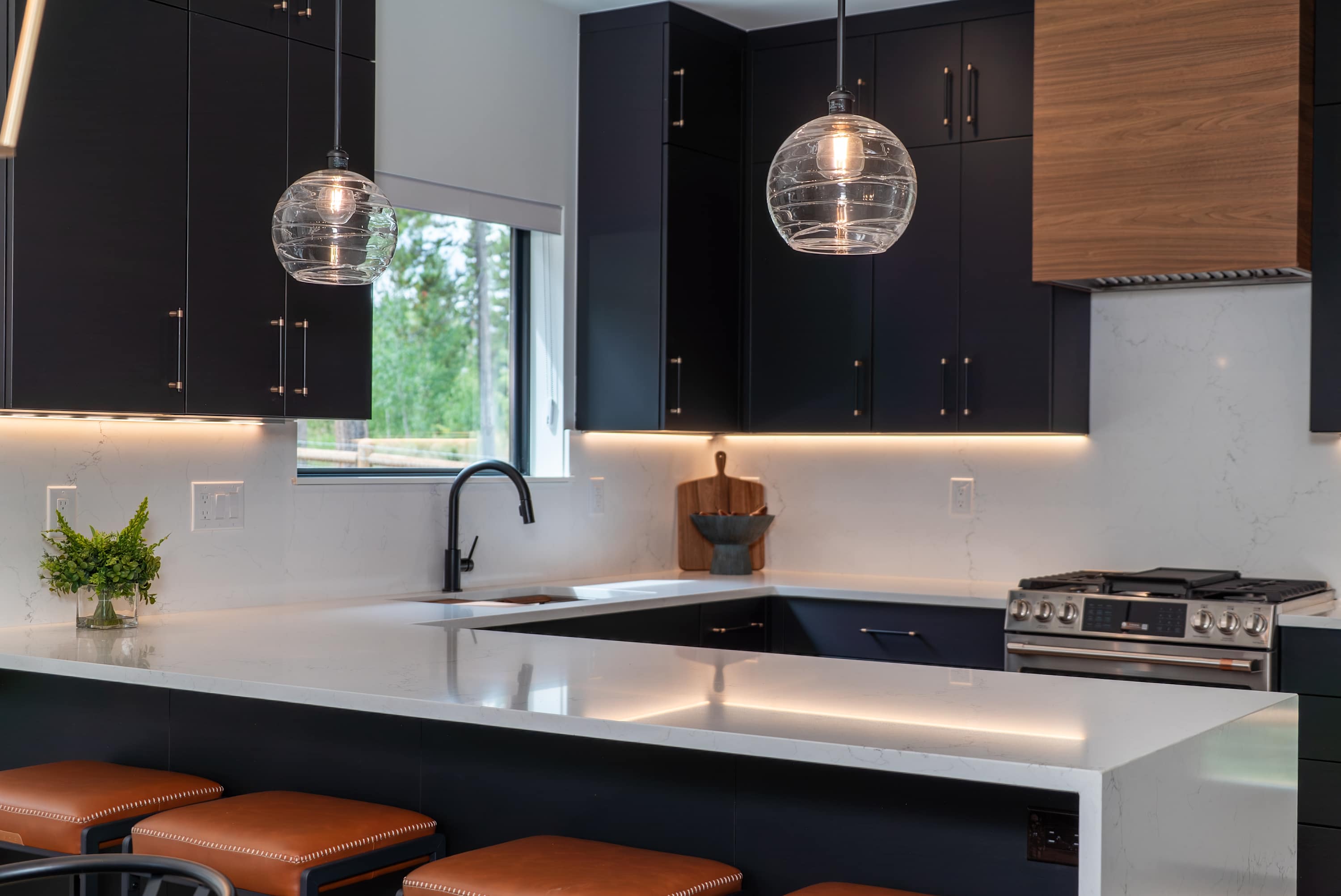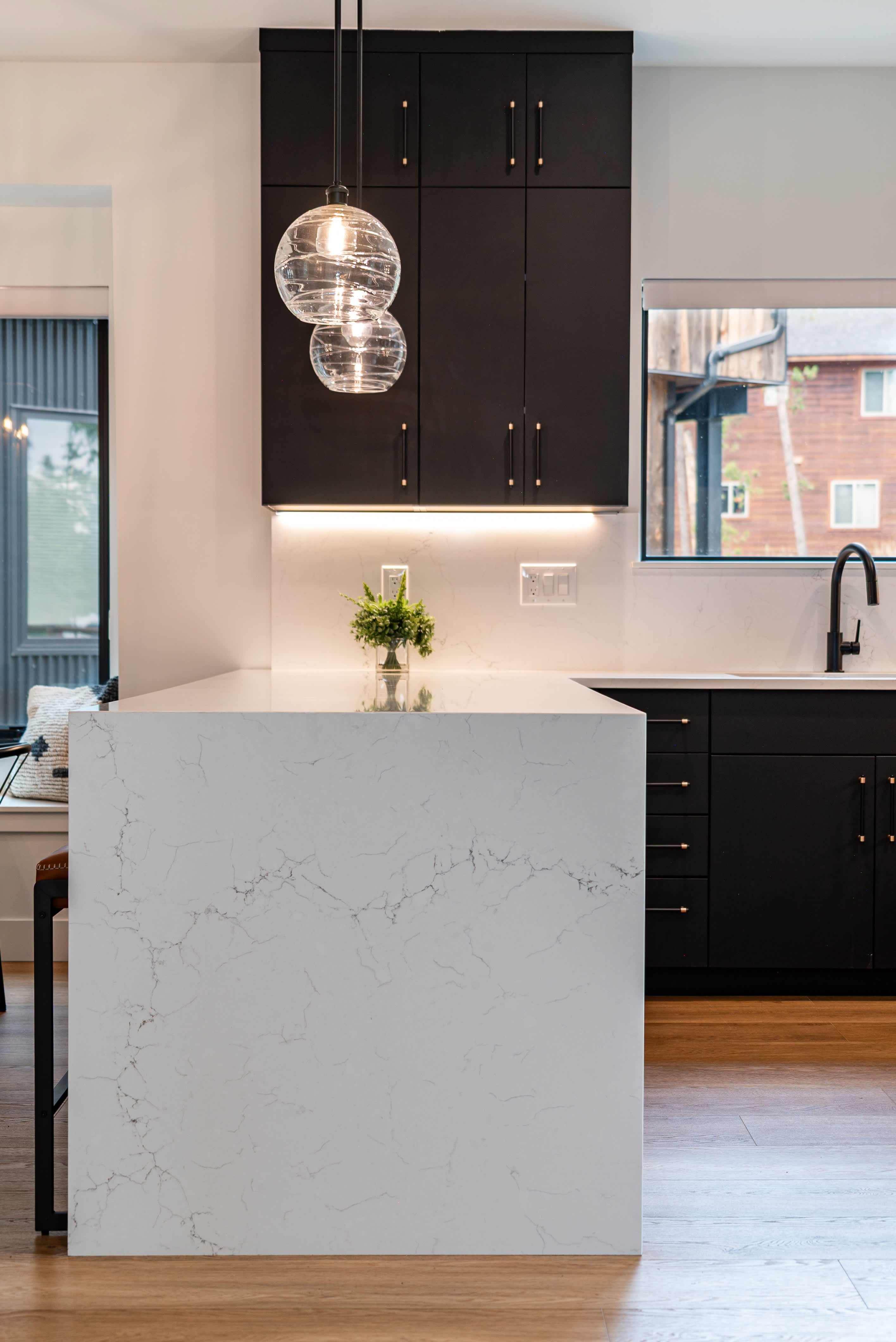 Step through the glass entryway into a world bathed in natural light , the open-concept great room features floor-to-ceiling windows, clean architectural lines, and cozy textures that blur the boundary between indoors and out. The chef-inspired kitchen offers waterfall-edge quartz countertops, designer cabinetry, and modern appliances, creating a perfect gathering space for après-ski cocktails or morning espresso with mountain air drifting through the pines.