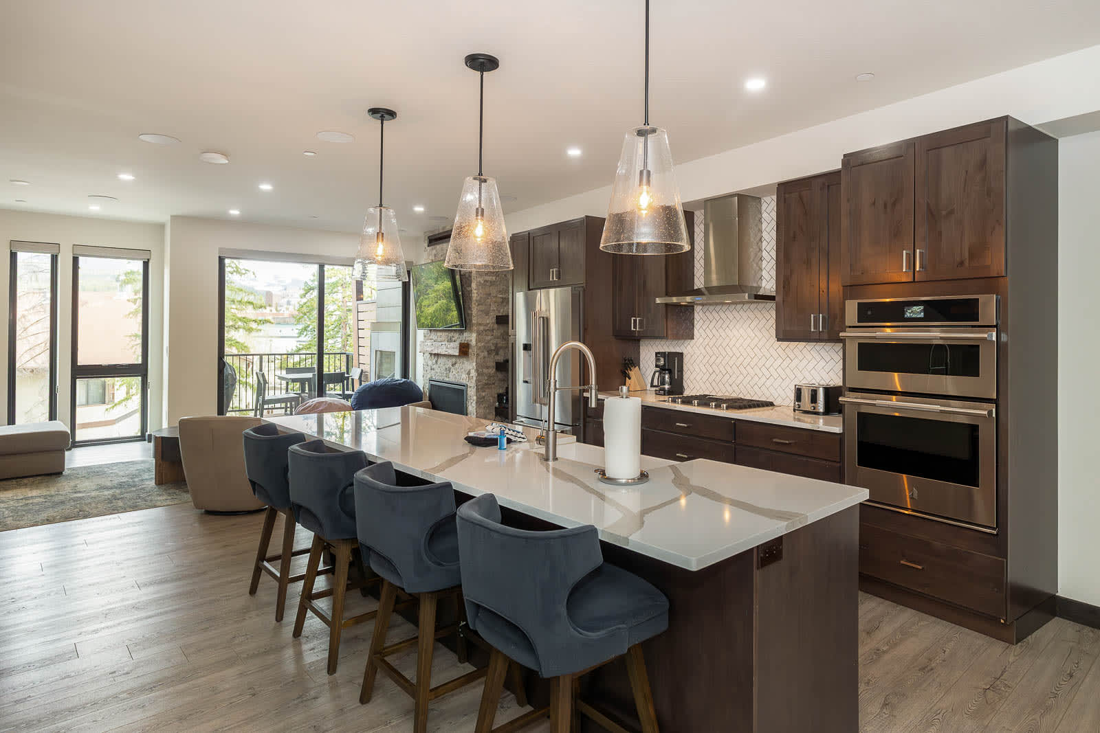 Après-Ski Indulgence: Enjoy three private decks, including one with a cozy outdoor fireplace perfect for watching the snow fall, and a serene private hot tub offering restorative warmth as you overlook the snow-dusted creek. Inside, the gourmet kitchen, equipped with high-end appliances and a custom granite bar, sets the stage for memorable meals, while multiple living areas offer inviting spaces to gather or unwind in style after a day on the slopes.