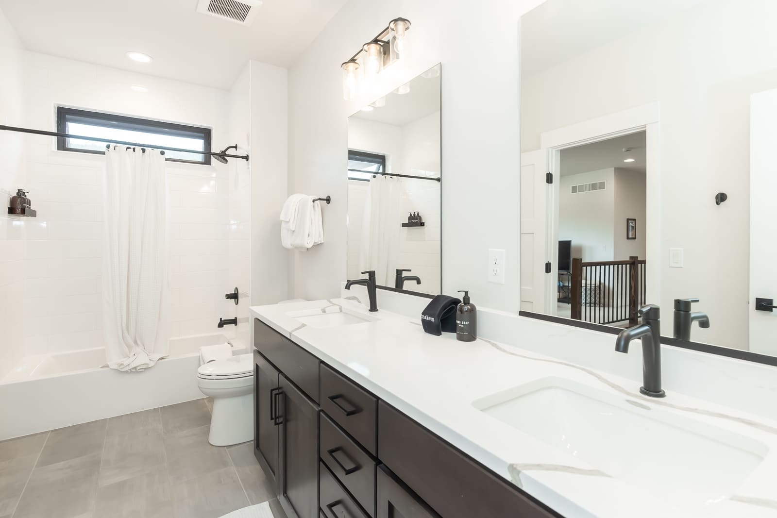 Accommodations at Silly Goose Lodge are designed with both comfort and flexibility in mind. The main floor features a serene bedroom with an ensuite bathroom, perfect for those seeking single-level living. Upstairs, a luxurious king primary bedroom, a charming queen bedroom, and a whimsical bunk room with two sets of custom bunk beds (twin-over-twin and full-over-full) provide ample space for the entire flock.