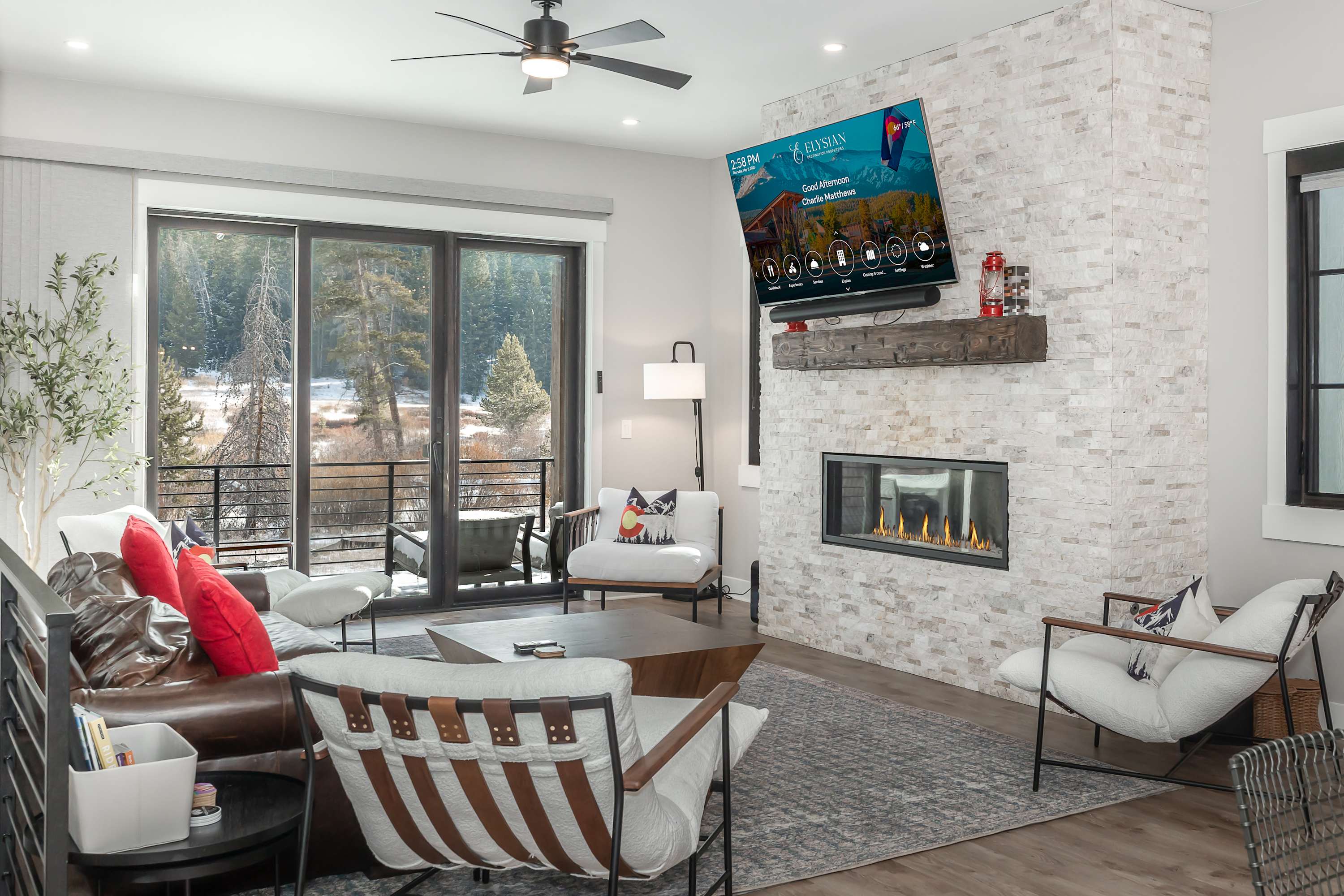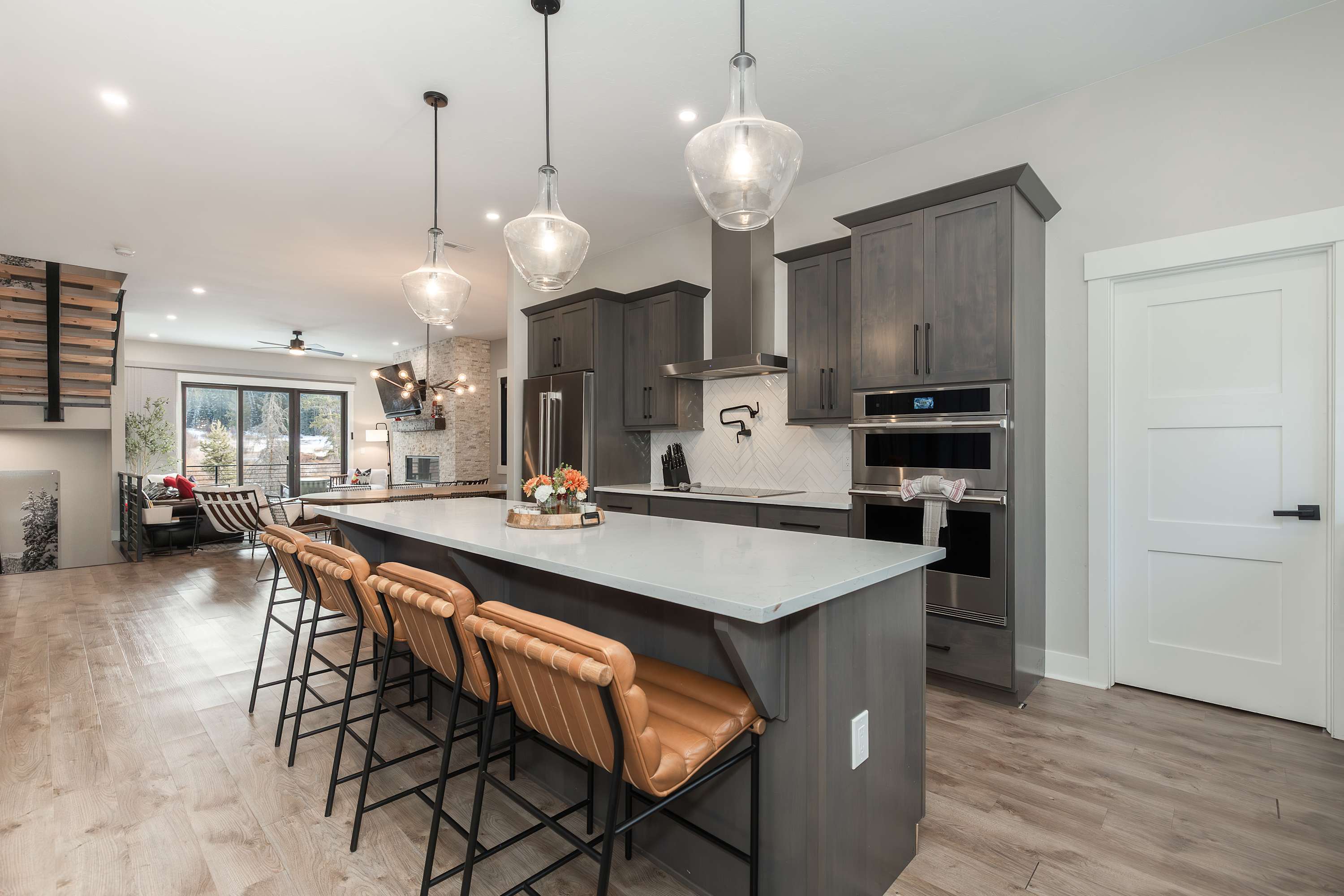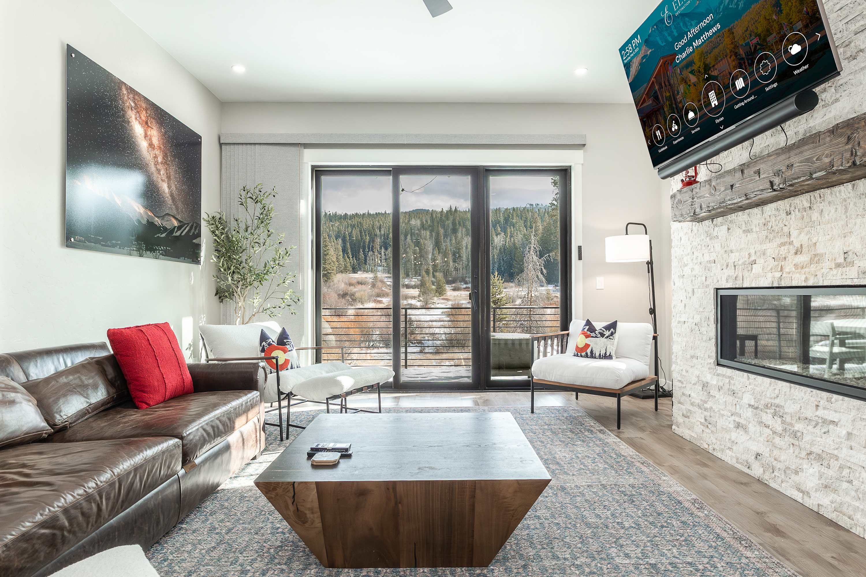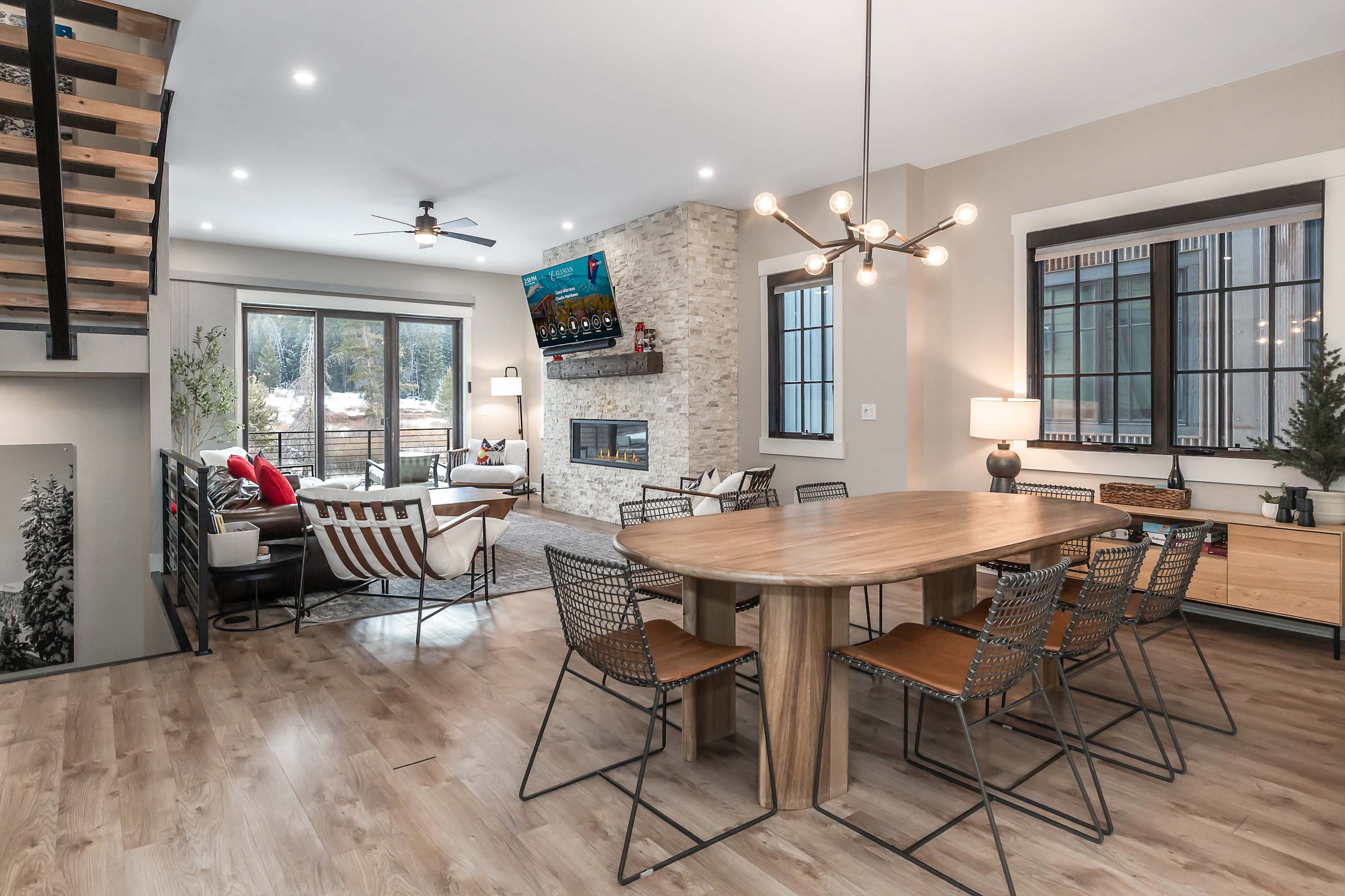 Mornings begin in the bright, open-concept great room overlooking the river. Contemporary furnishings, warm textures, and a sleek gas fireplace create a calming centerpoint for your stay. The fully equipped chef’s kitchen features modern appliances and island seating—ideal for family-style breakfasts, après-ski appetizers, or easy evening meals.