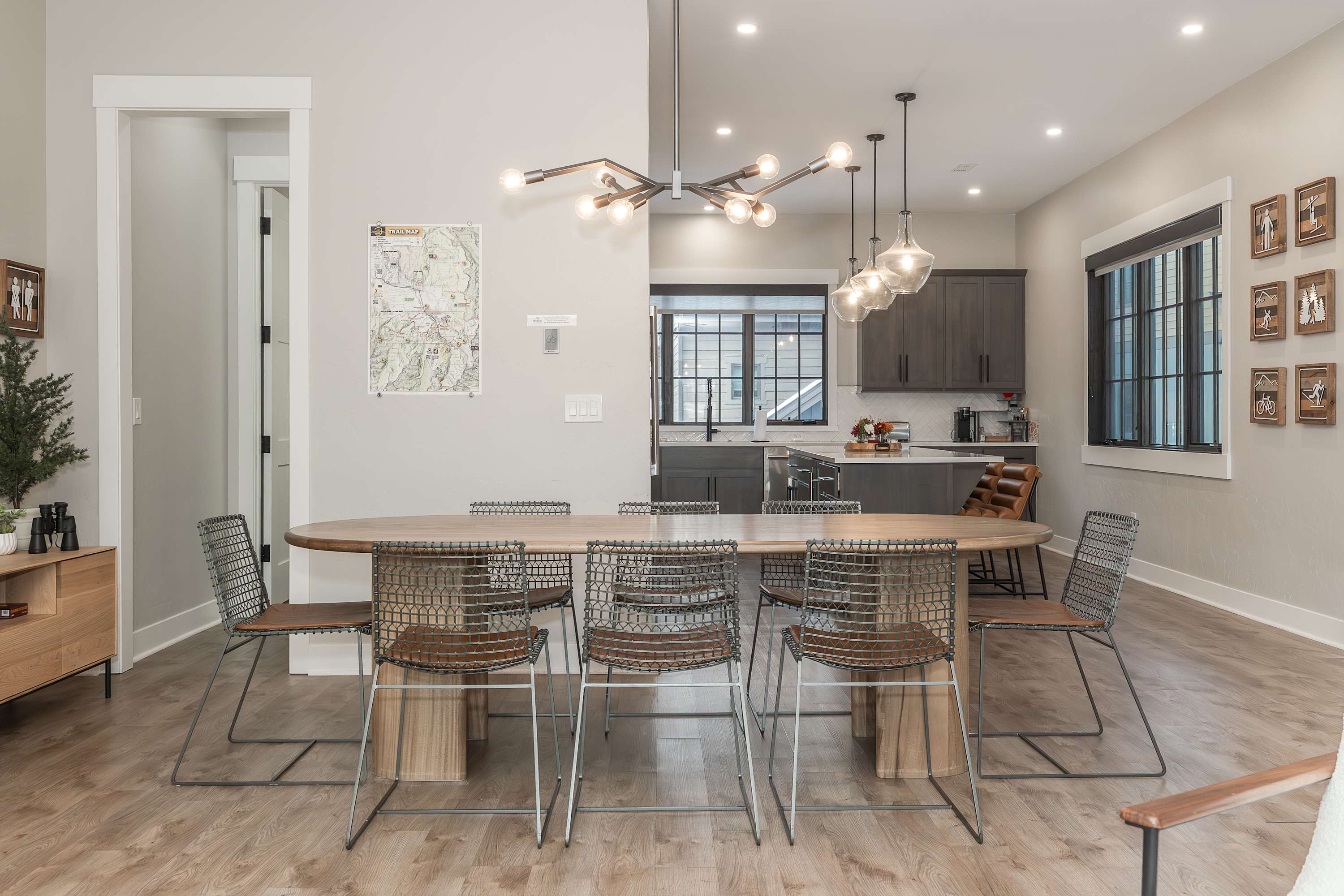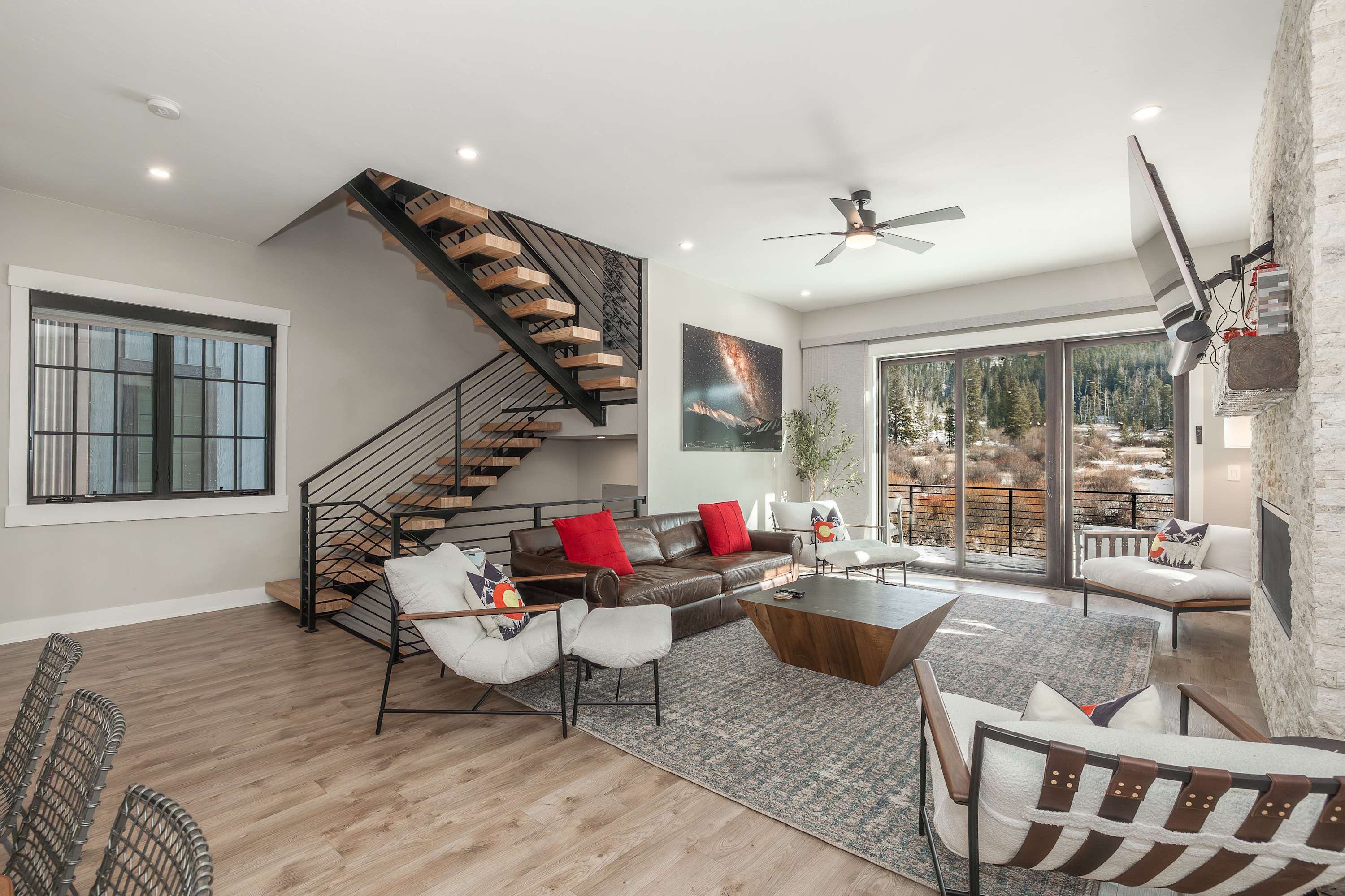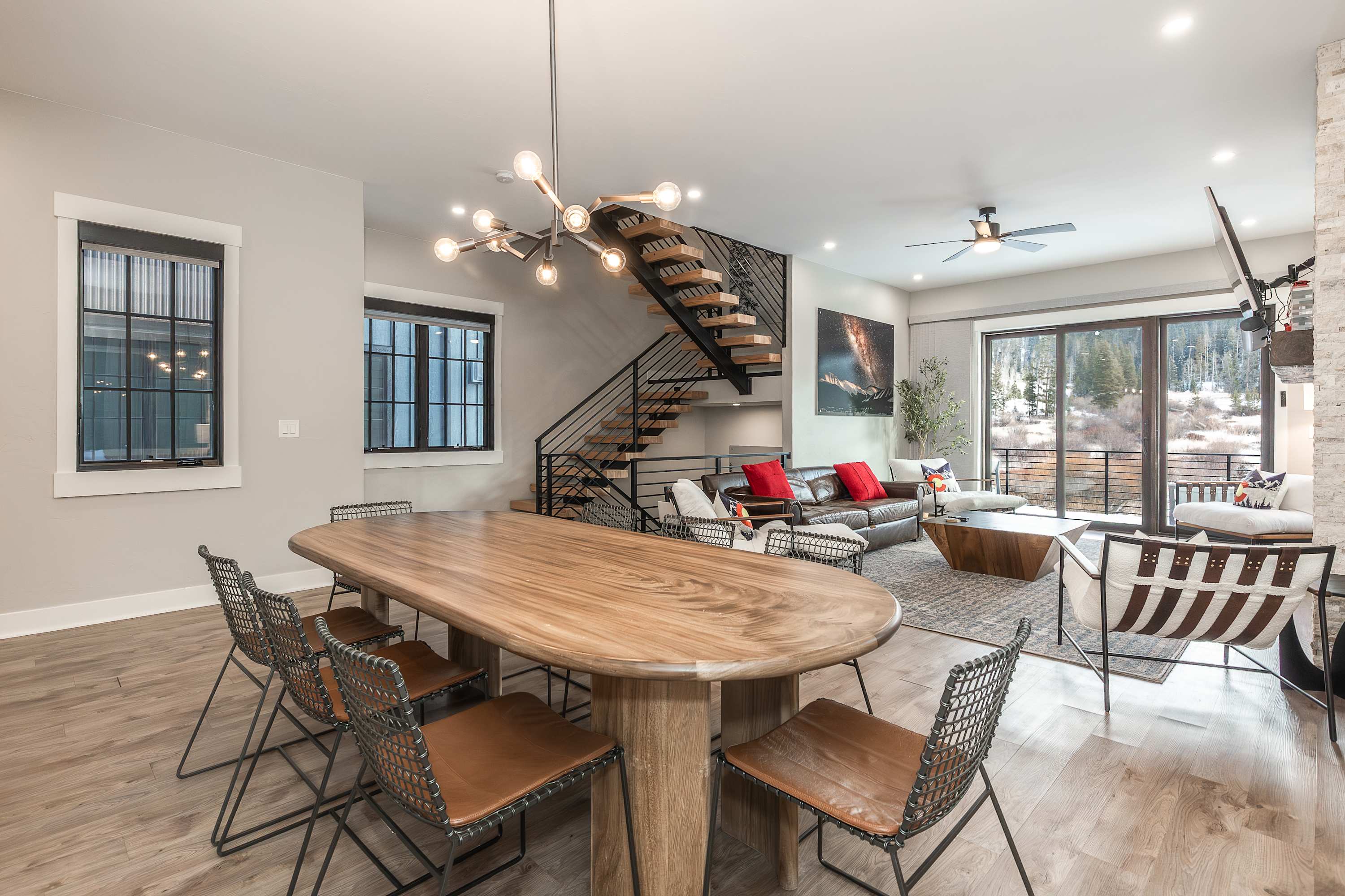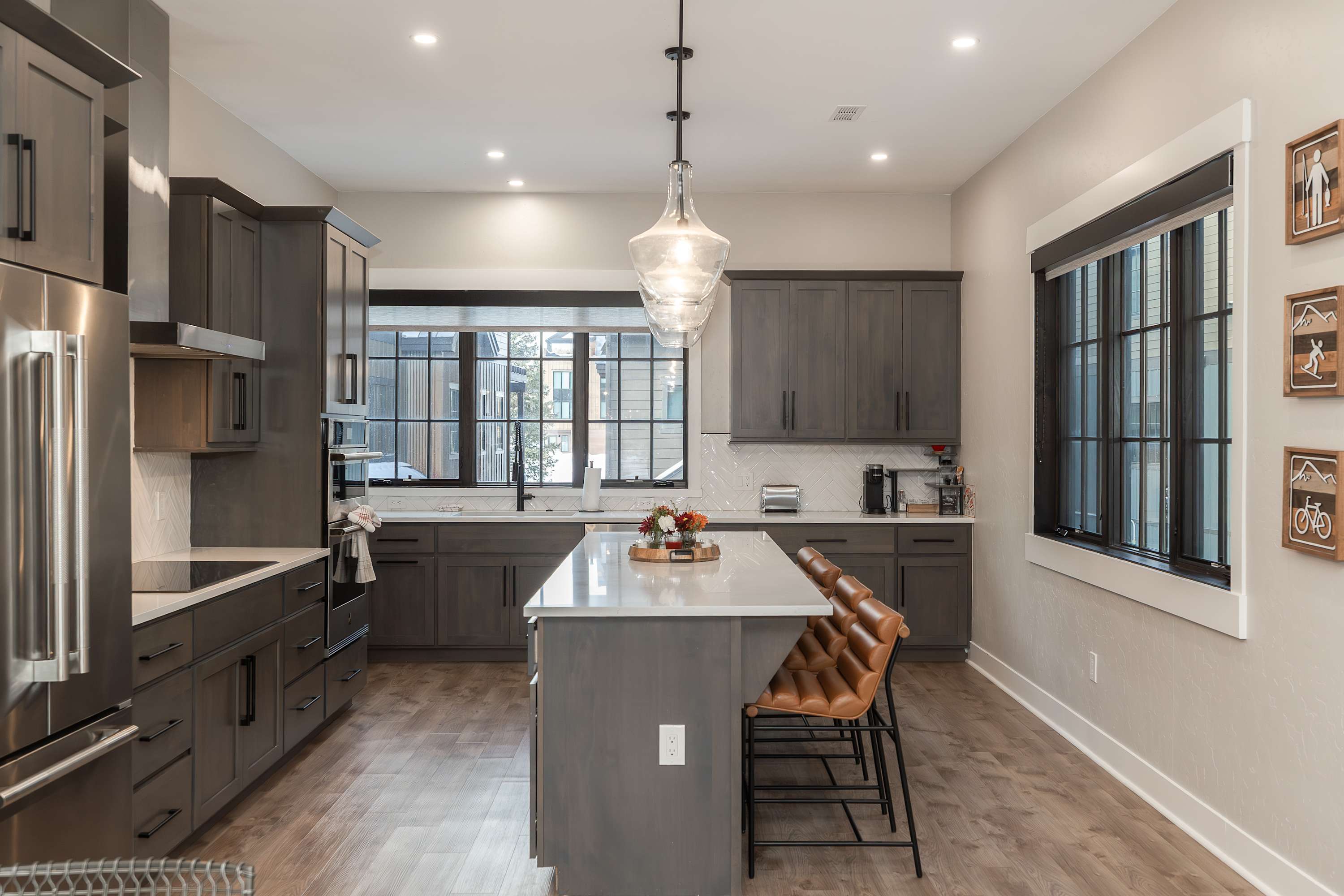 Mornings begin in the bright, open-concept great room overlooking the river. Contemporary furnishings, warm textures, and a sleek gas fireplace create a calming centerpoint for your stay. The fully equipped chef’s kitchen features modern appliances and island seating—ideal for family-style breakfasts, après-ski appetizers, or easy evening meals.