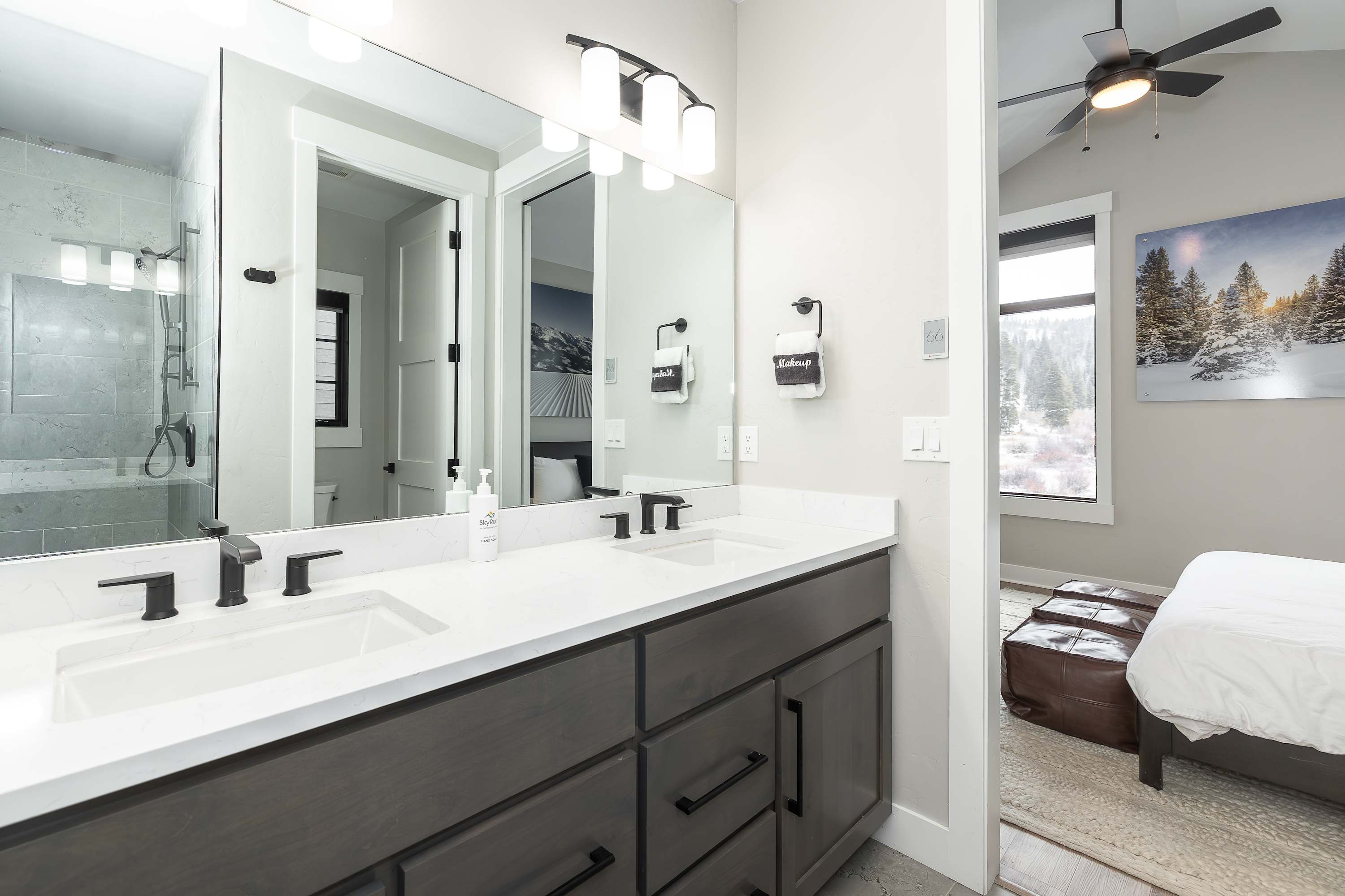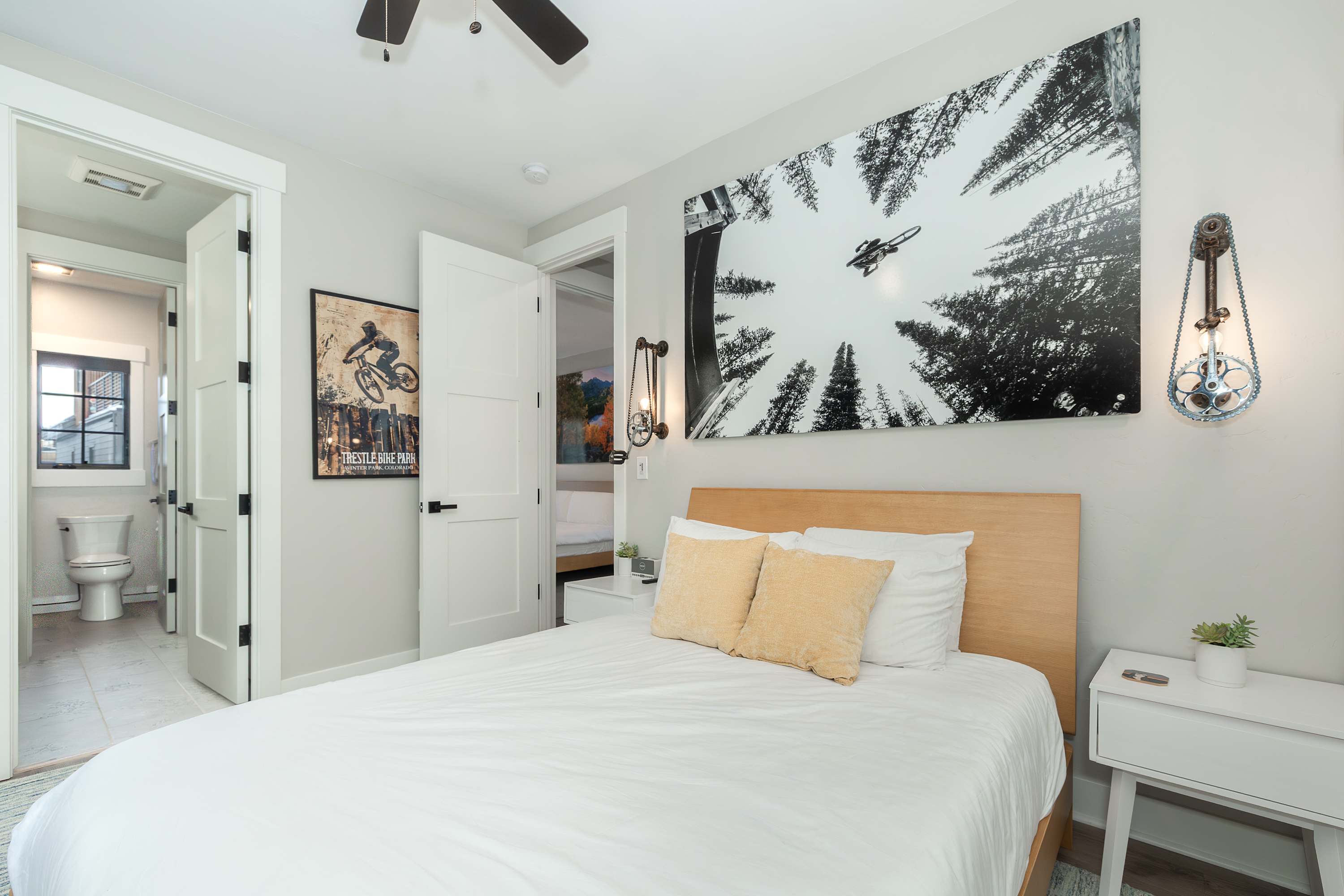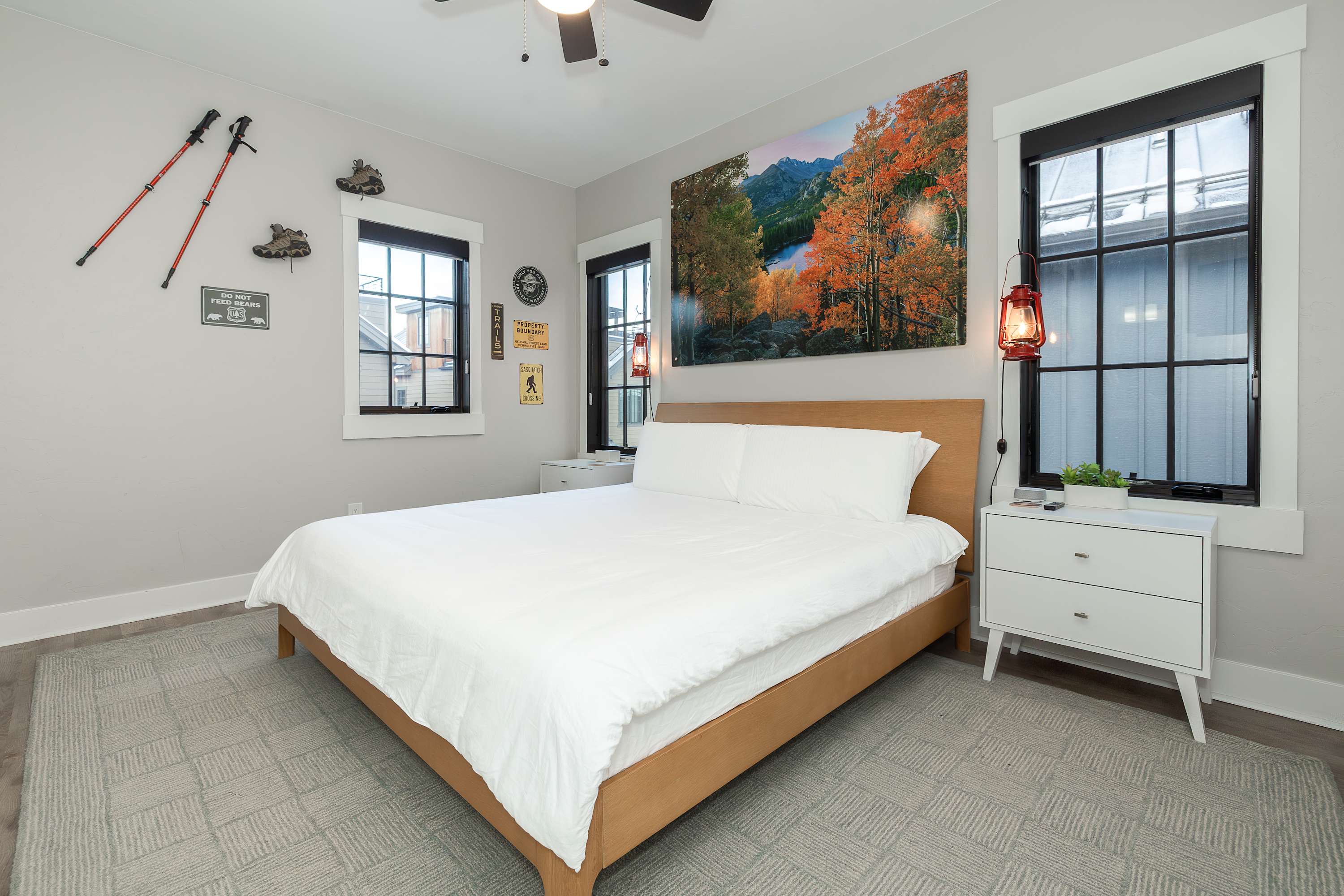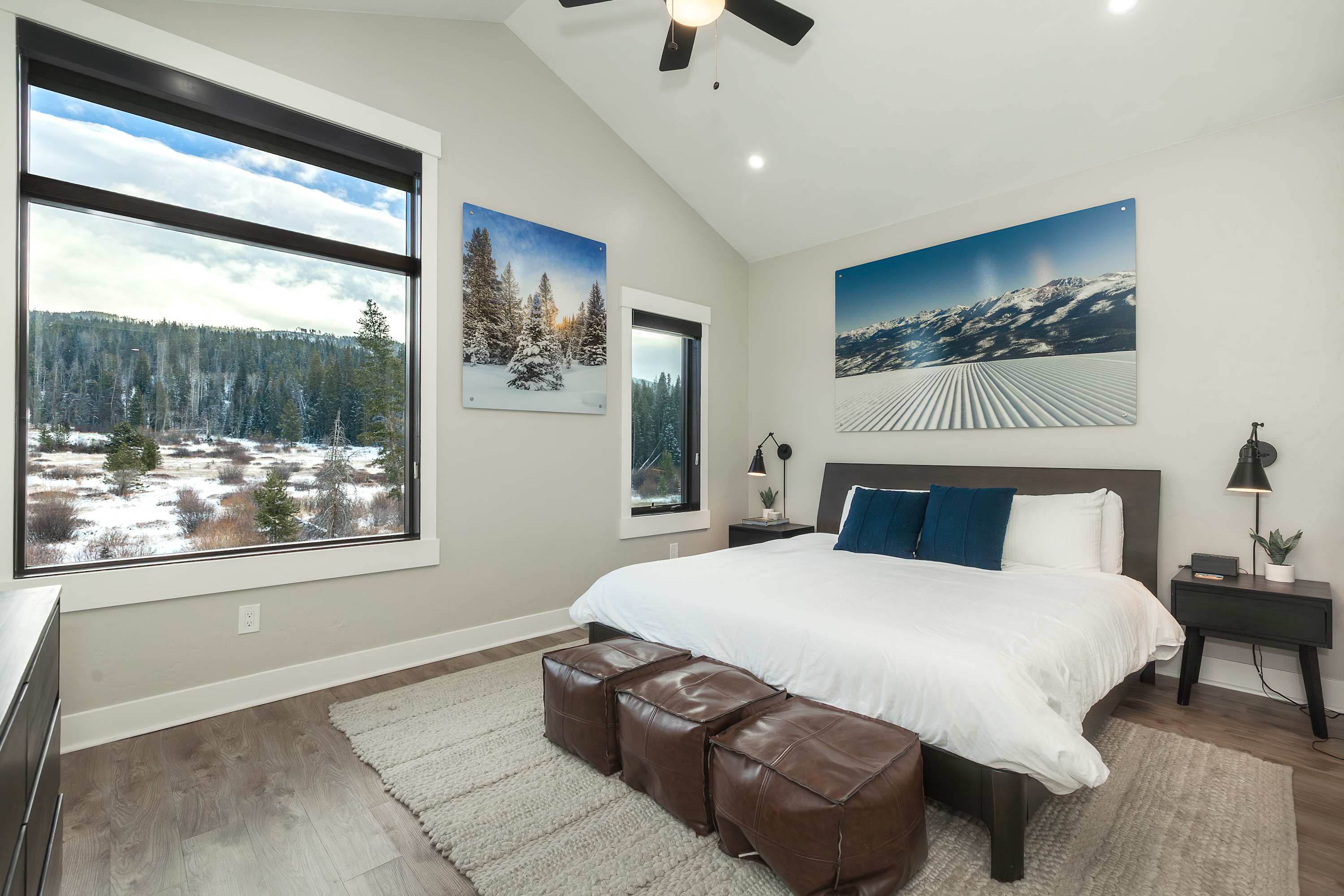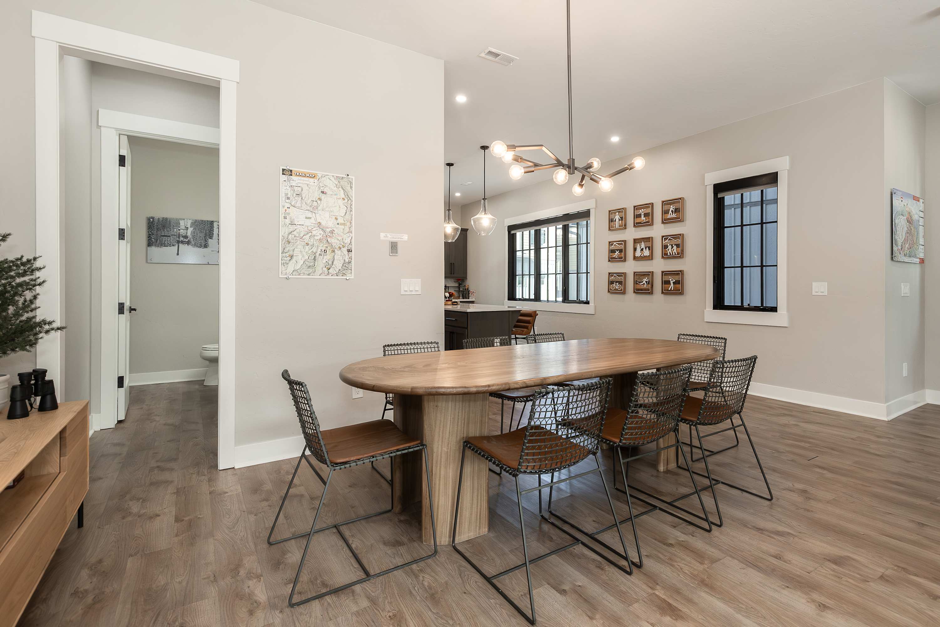 Mornings begin in the bright, open-concept great room overlooking the river. Contemporary furnishings, warm textures, and a sleek gas fireplace create a calming centerpoint for your stay. The fully equipped chef’s kitchen features modern appliances and island seating—ideal for family-style breakfasts, après-ski appetizers, or easy evening meals.