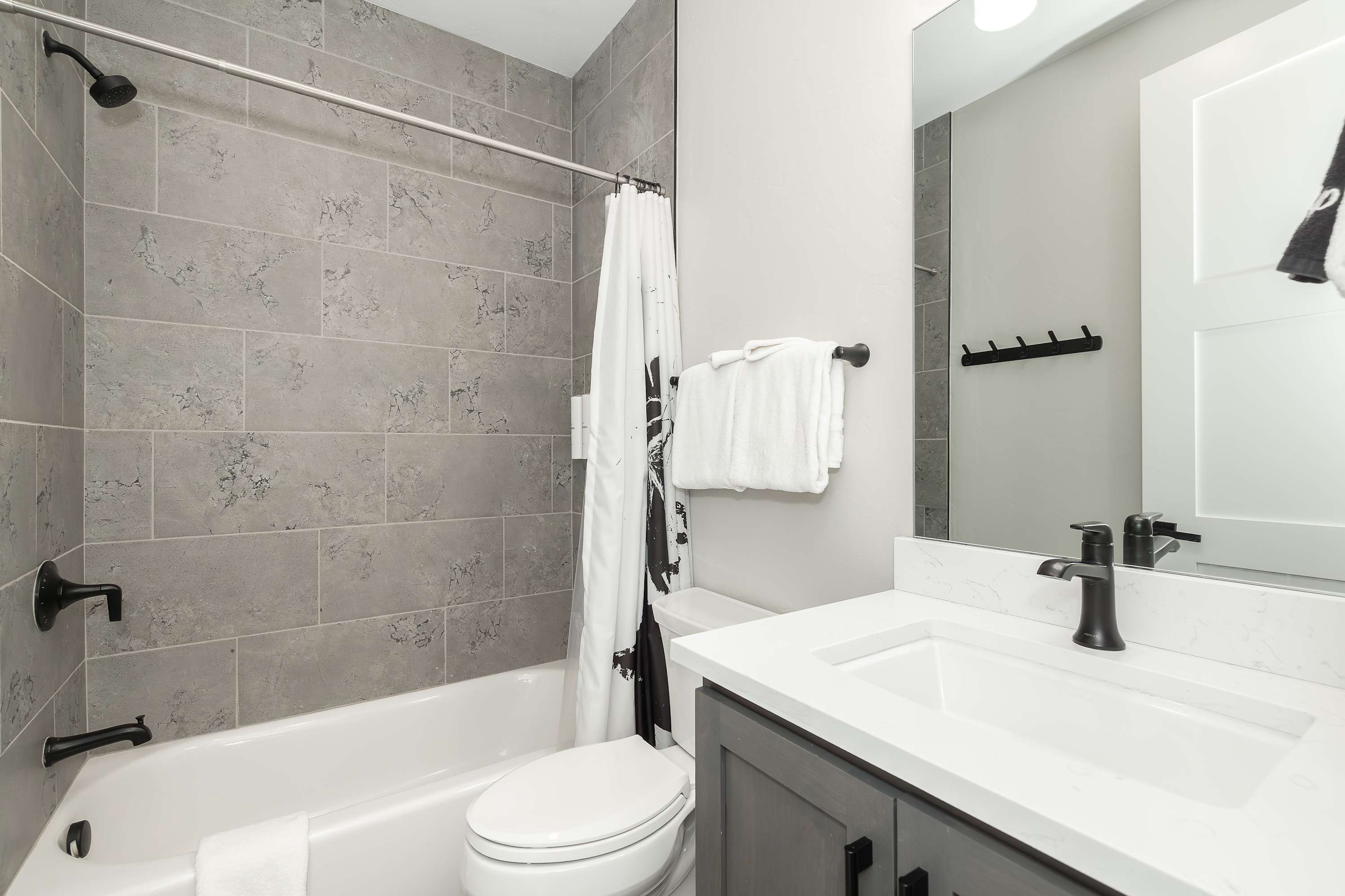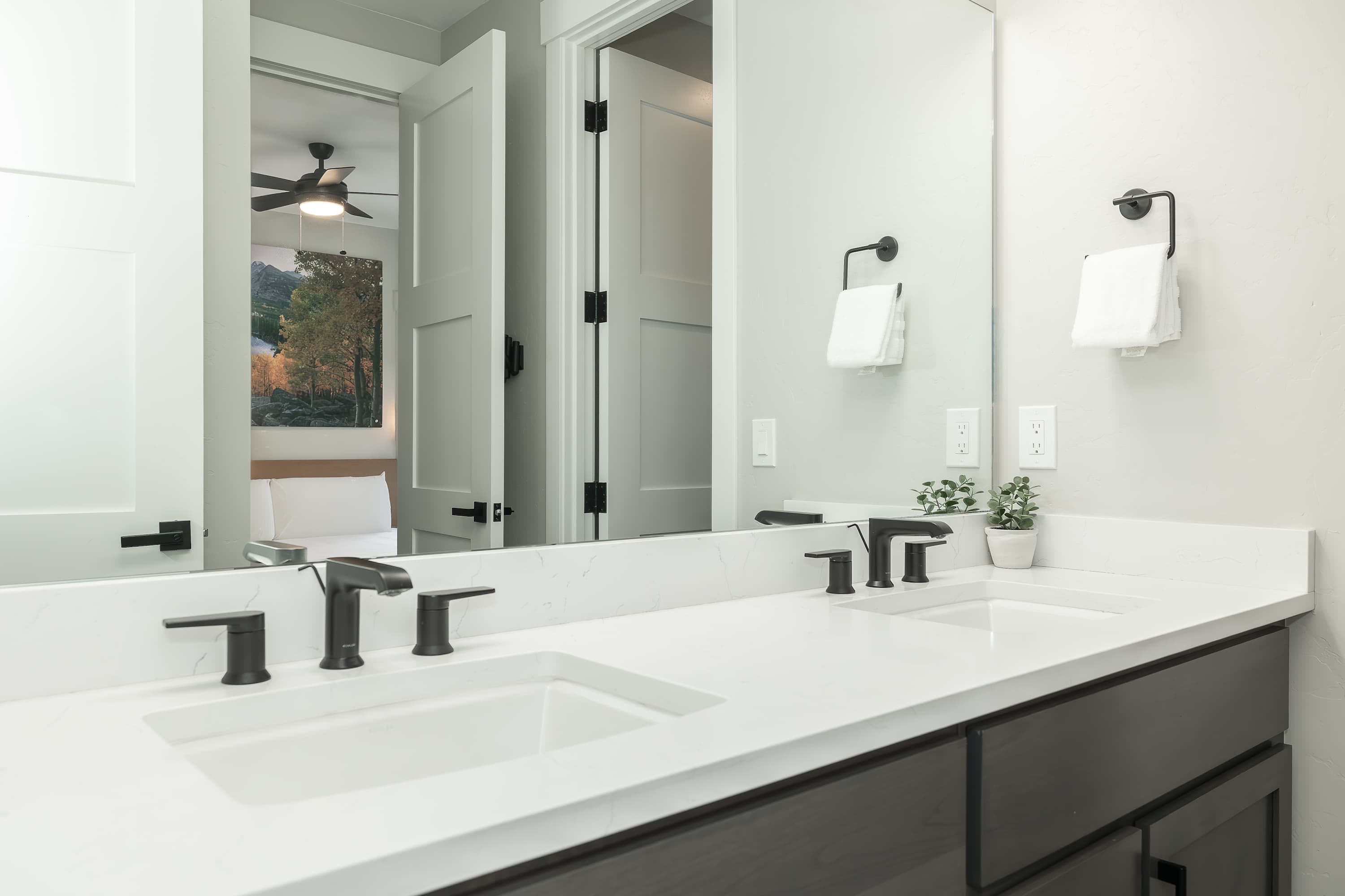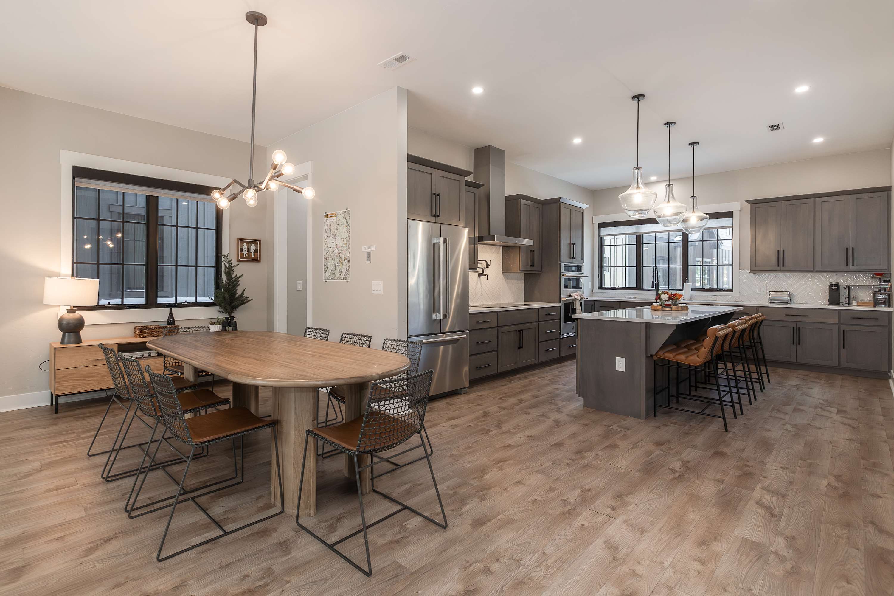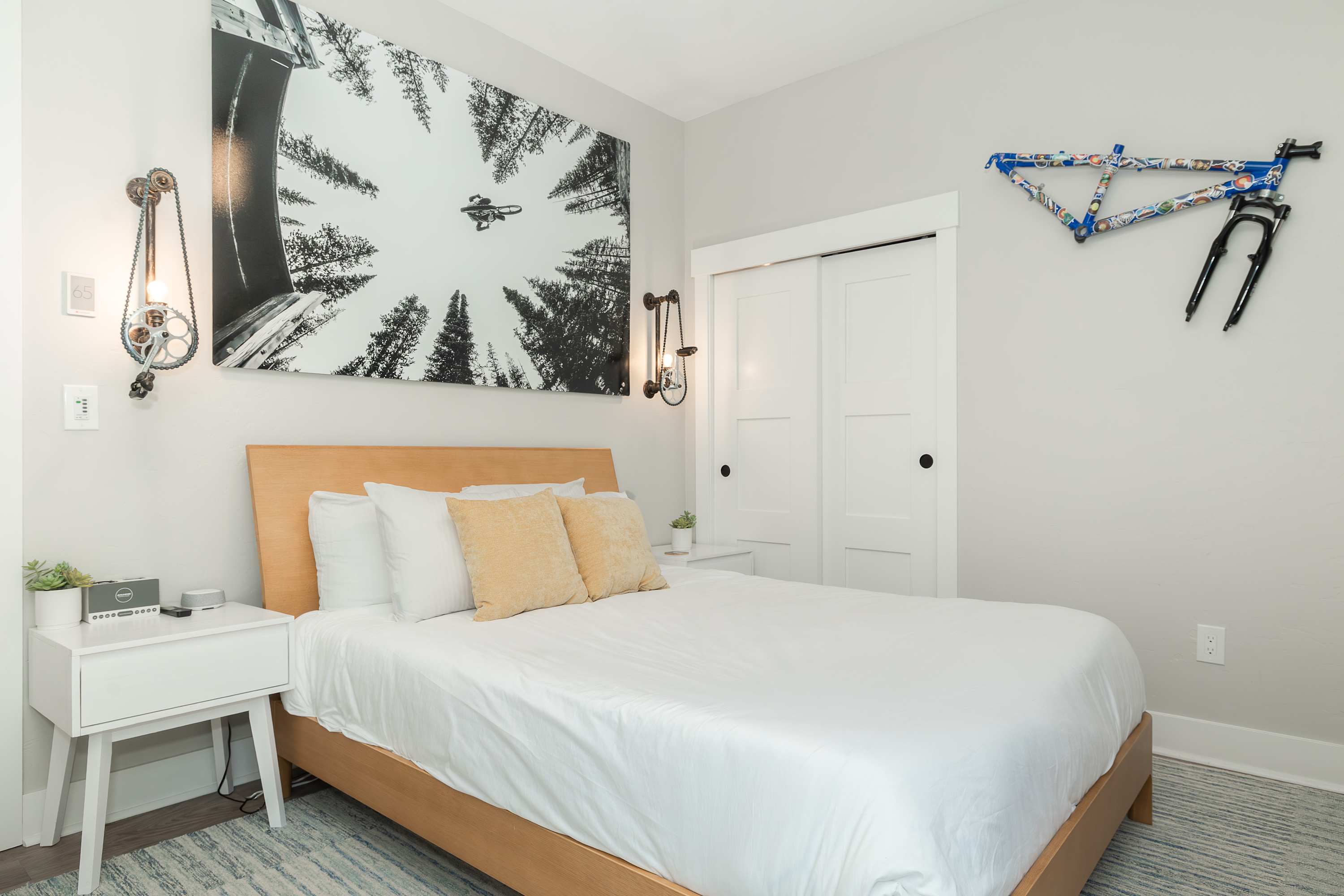 Mornings begin in the bright, open-concept great room overlooking the river. Contemporary furnishings, warm textures, and a sleek gas fireplace create a calming centerpoint for your stay. The fully equipped chef’s kitchen features modern appliances and island seating—ideal for family-style breakfasts, après-ski appetizers, or easy evening meals.