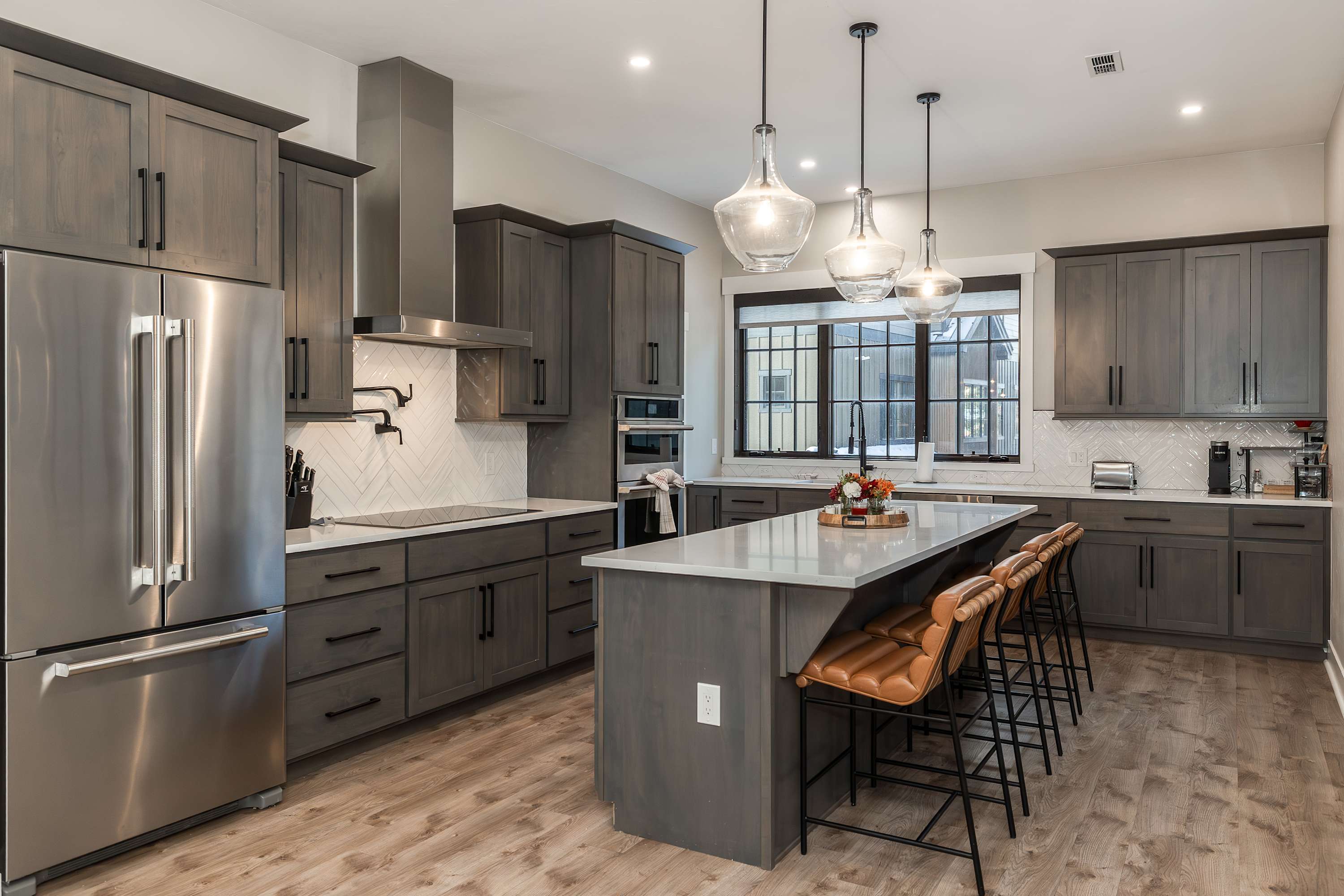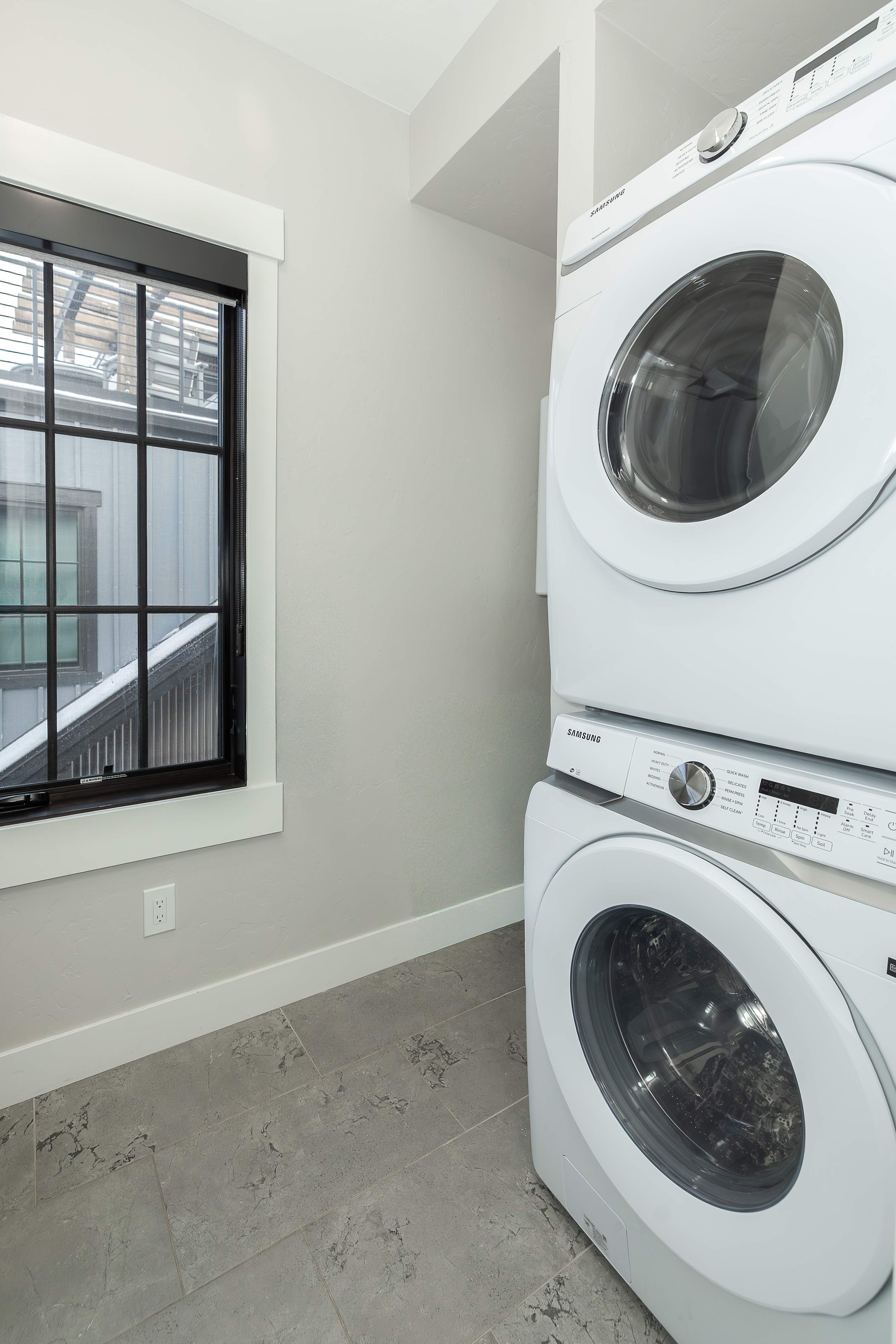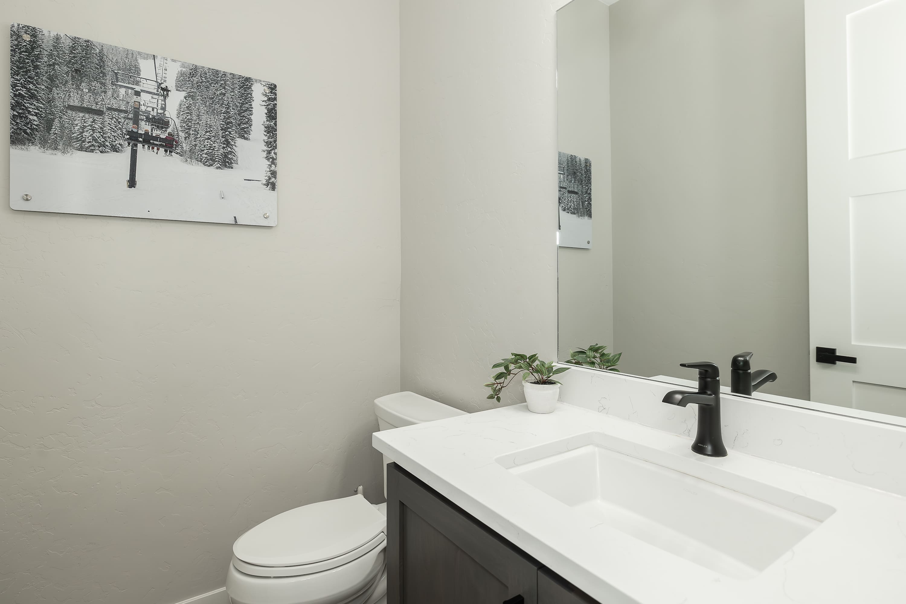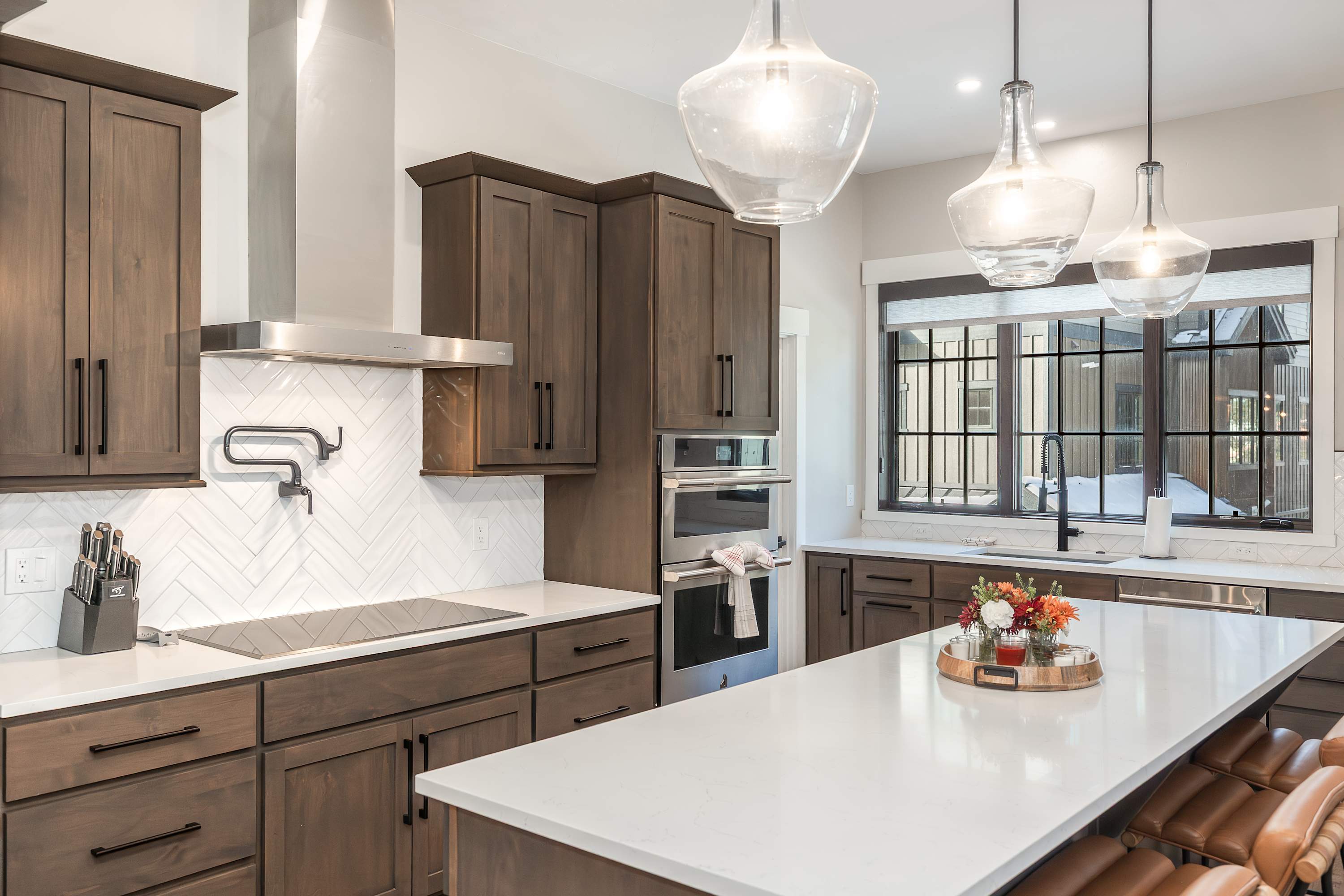 Mornings begin in the bright, open-concept great room overlooking the river. Contemporary furnishings, warm textures, and a sleek gas fireplace create a calming centerpoint for your stay. The fully equipped chef’s kitchen features modern appliances and island seating—ideal for family-style breakfasts, après-ski appetizers, or easy evening meals.