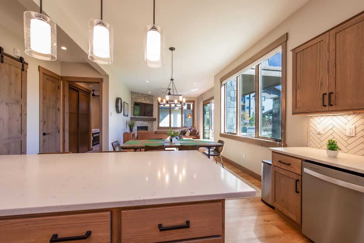 Open & Airy: The open-concept living area fills with natural light reflecting off the snow-covered peaks, offering a warm, welcoming place to relax.